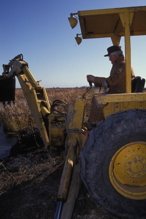A U.S. Fish and Wildlife Service employee uses a tractor to manage a wetland habitat area in Minnesota.