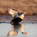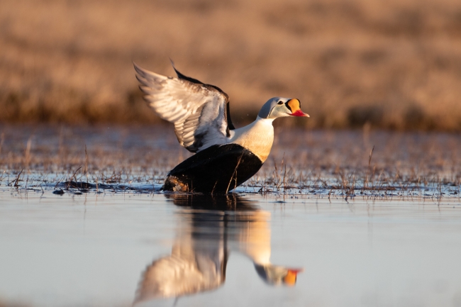 A male king eider lifts off from a tundra pond
