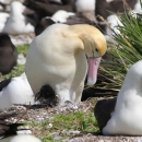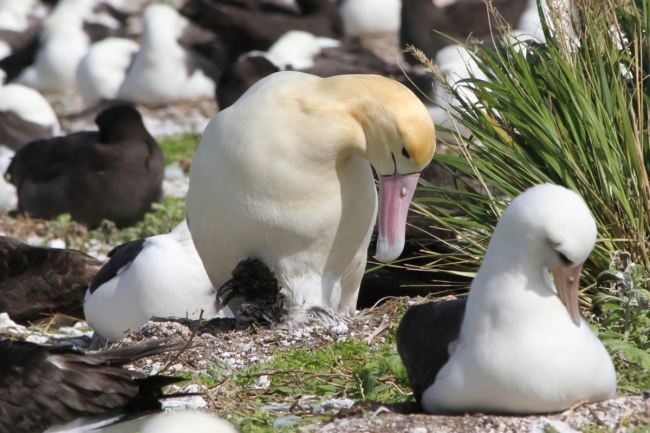 A male short-tailed albatross protects his chick. As of 2010, the short-tailed albatross population is estimated to be 1,200 birds. Of these, the total number of breeding age birds is thought to be approximately 600 birds. Image taken from USFWS Pacific Region Flickr page.