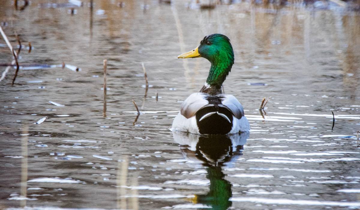 Mallard drake swims among submerged wetland vegetation at Browns Park NWR.