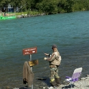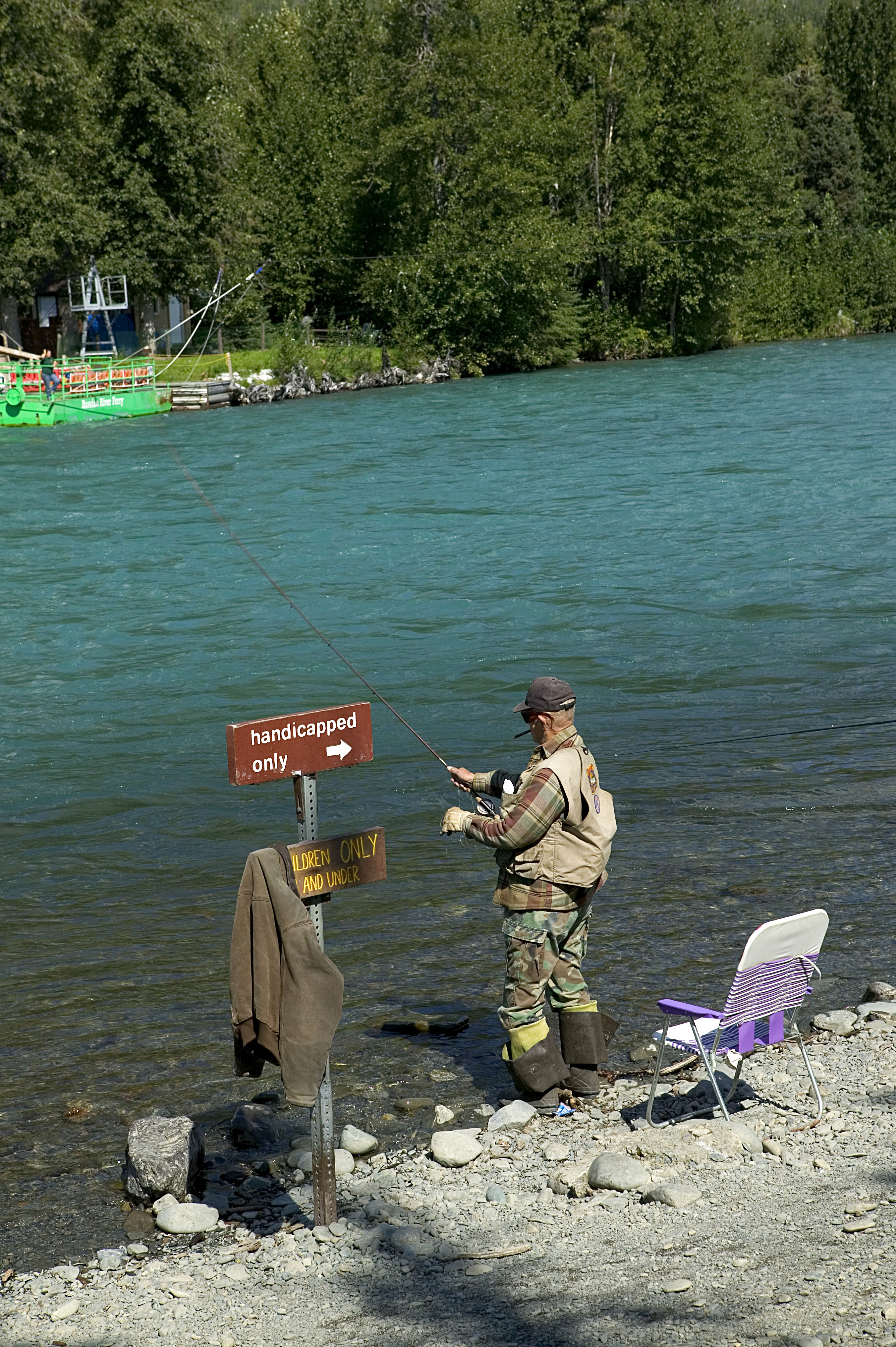 Adult male fishing in a handicapped area while the Russian River Ferry passes by.