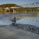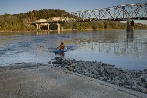 Man in orange life vest paddling blue kayak toward boat ramp on the Missouri River with long highway bridge in background.