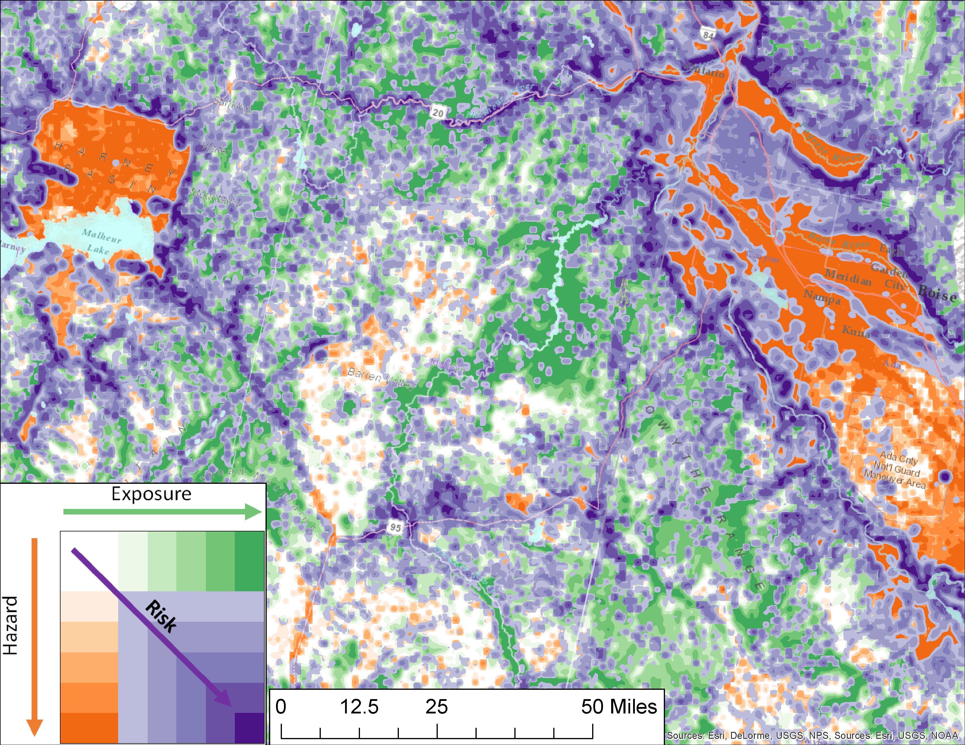Map of predicted electrocution risk for golden eagles occupying breeding habitat in the Northern Great Basin. By prioritizing retrofitting efforts in areas with higher risk (darker purples), utilities and other responsible entities can maximize their program's effectiveness and conservation benefit to golden eagles. USFWS