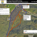 Map of San Diego National Wildlife Refuge Sweetwater Interpretive Loop parking closure. The Sweetwater Interpretive Loop trail is shown in red. The County trail connecting to the interpretive loop is shown in blue. Text bubble for the county trail reads "County trail links to Sweetwater interpretive trail. Exit using the county trail while bridge is out. Check social media for bridge progress updates." Towards the north east of this, a text bubble point the county's parking and just below, a text bubble points to the closed refuge parking lot. The legend is on the bottom right and shows the Sweetwater Interpretive Loop trail in red. For further assistance understanding the map, contact Refuge Manager Dwane Binns 619-385-1190.