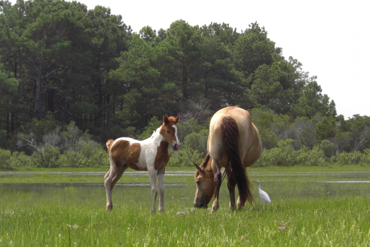 Two herds of Chincoteague Ponies, also known as the Assateague horse, graze freely on Assateague Island.
