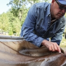 Mark Endries helps Yancey County, N.C. fifth-grade students pull aquatic insects from a kick seine as part of the 2023 Toes in the Toe educational event.
