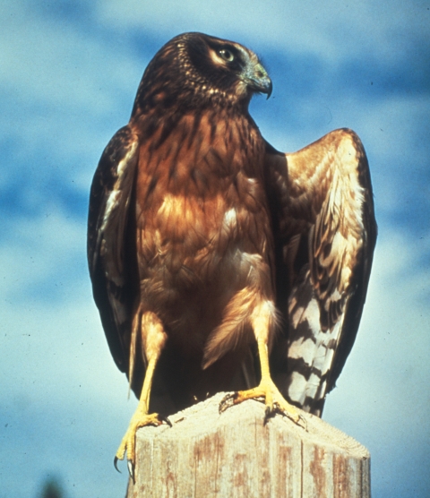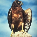 A marsh hawk, also known also as a hen harrier, uses an upright log for a perch.