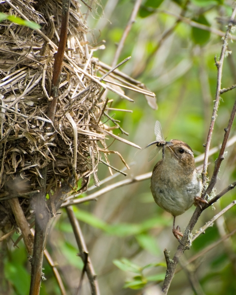 A marsh wren brings food to the nest.