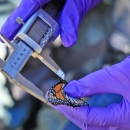 Biologist Rachel Williams measures a monarch butterfly. The team collects additional data on the monarchs including wingspan, sex and weight, before tagging and releasing them.
