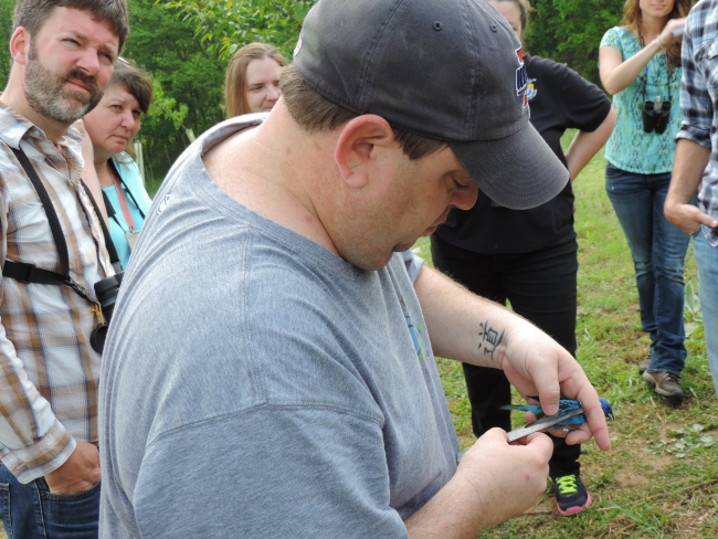 This picture shows a U.S. Fish and Wildlife Service employee holding a Indigo Bunting during a bird banding exercise at the Basic Bird Biology class.