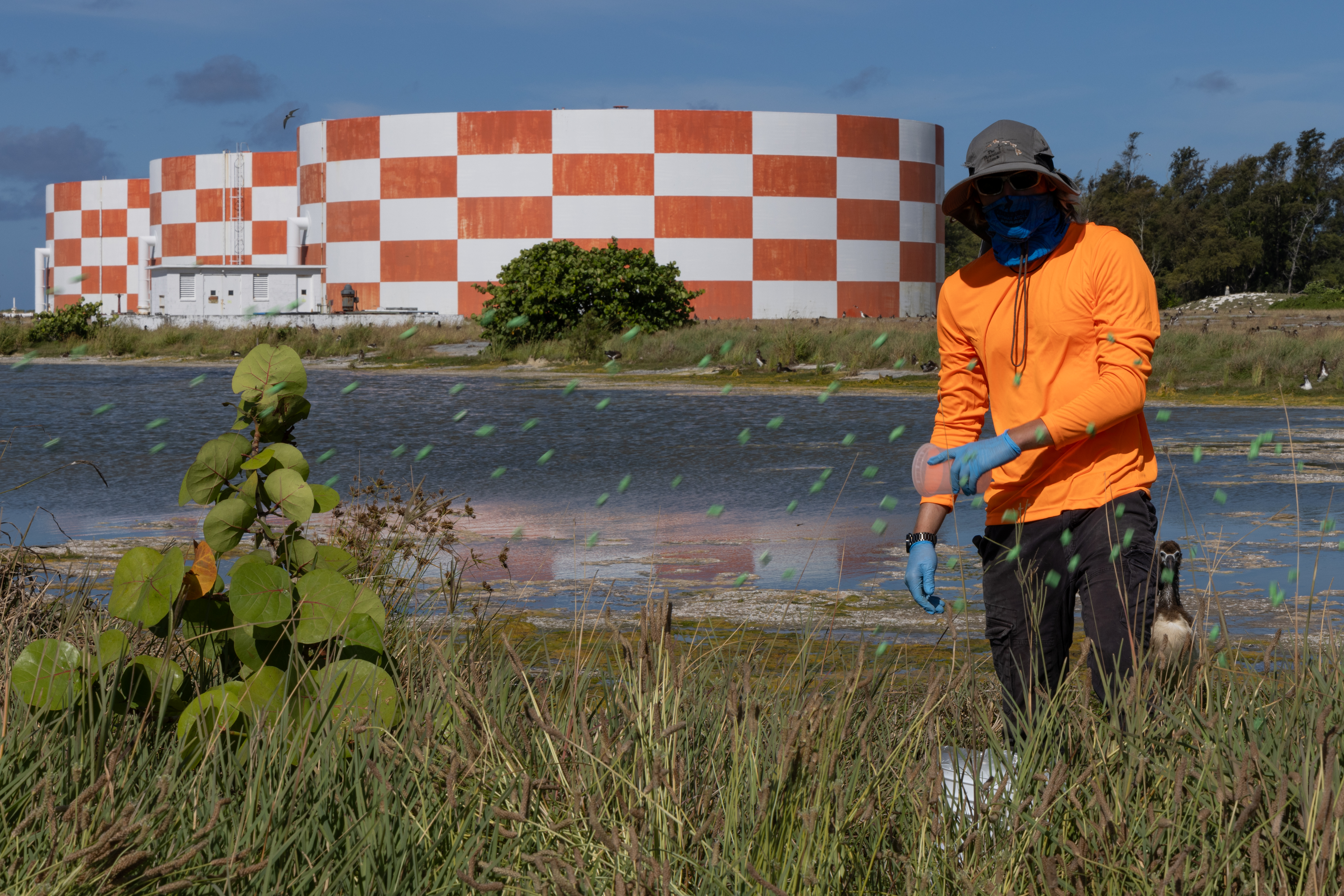A member of the 6-Month Volunteer team hand broadcasting bait around Catchment where the helicopter didn’t spread bait during the Seabird Protection Project on Midway Atoll National Wildlife Refuge