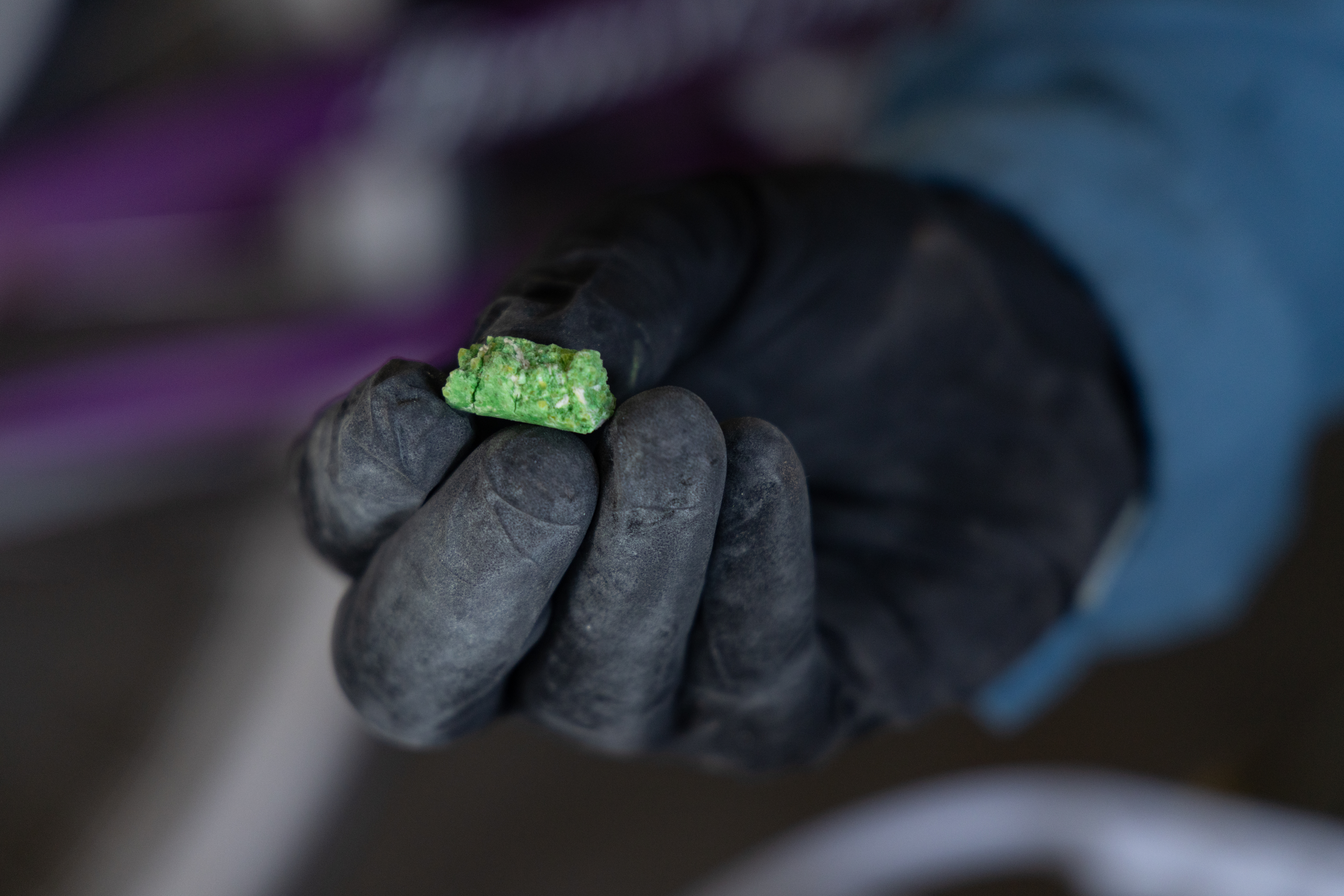A member of the Infrastructure Baiting Team confirms mouse bite marks on a bait pellet during the Seabird Protection Project on Midway Atoll National Wildlife Refuge.