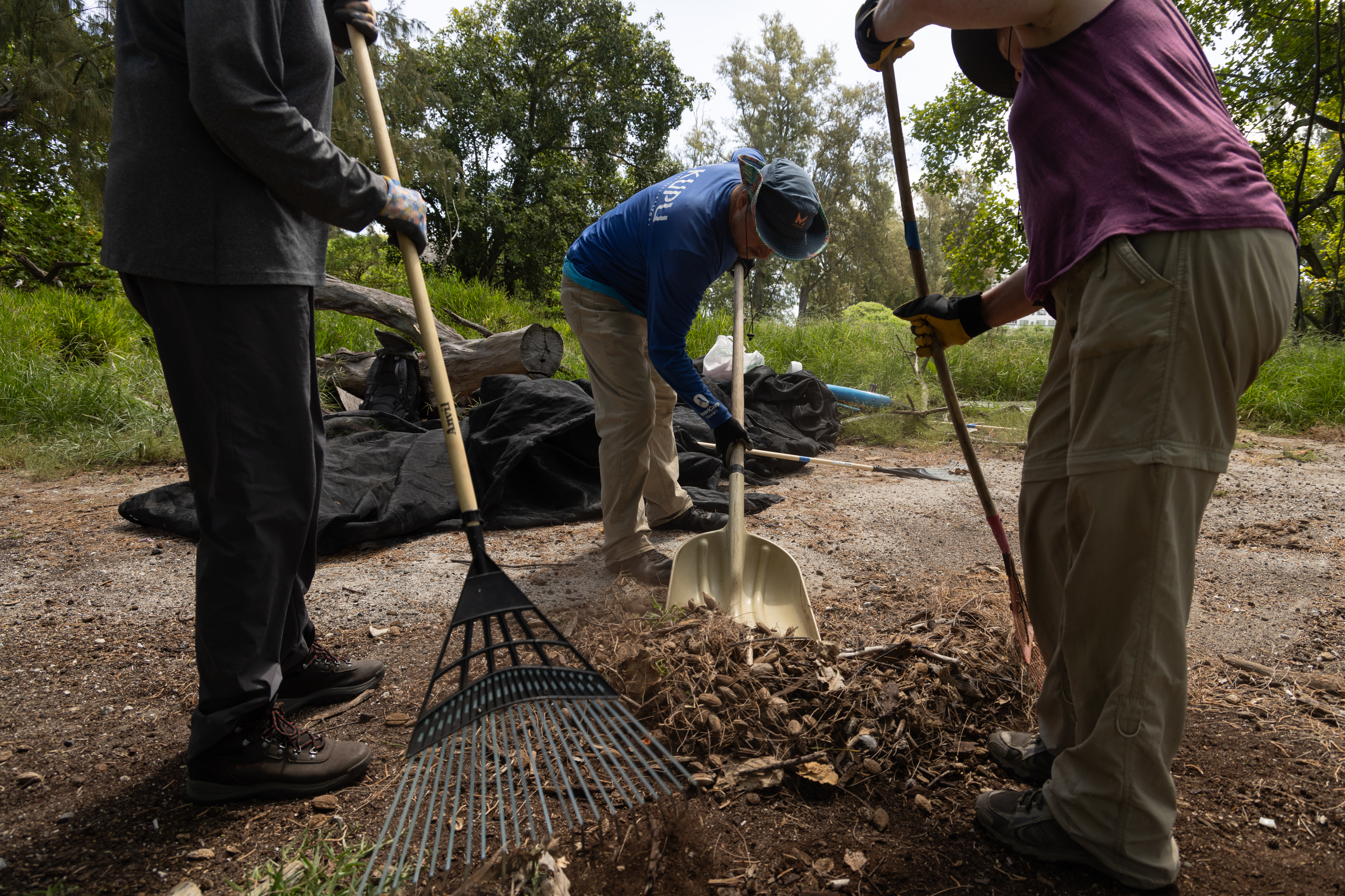 Members of the Human Based Food Source Team (PHATT) raking and collecting fallen seeds from a false kamani tree on Midway Atoll National Wildlife Refuge during the Seabird Protection Project.
