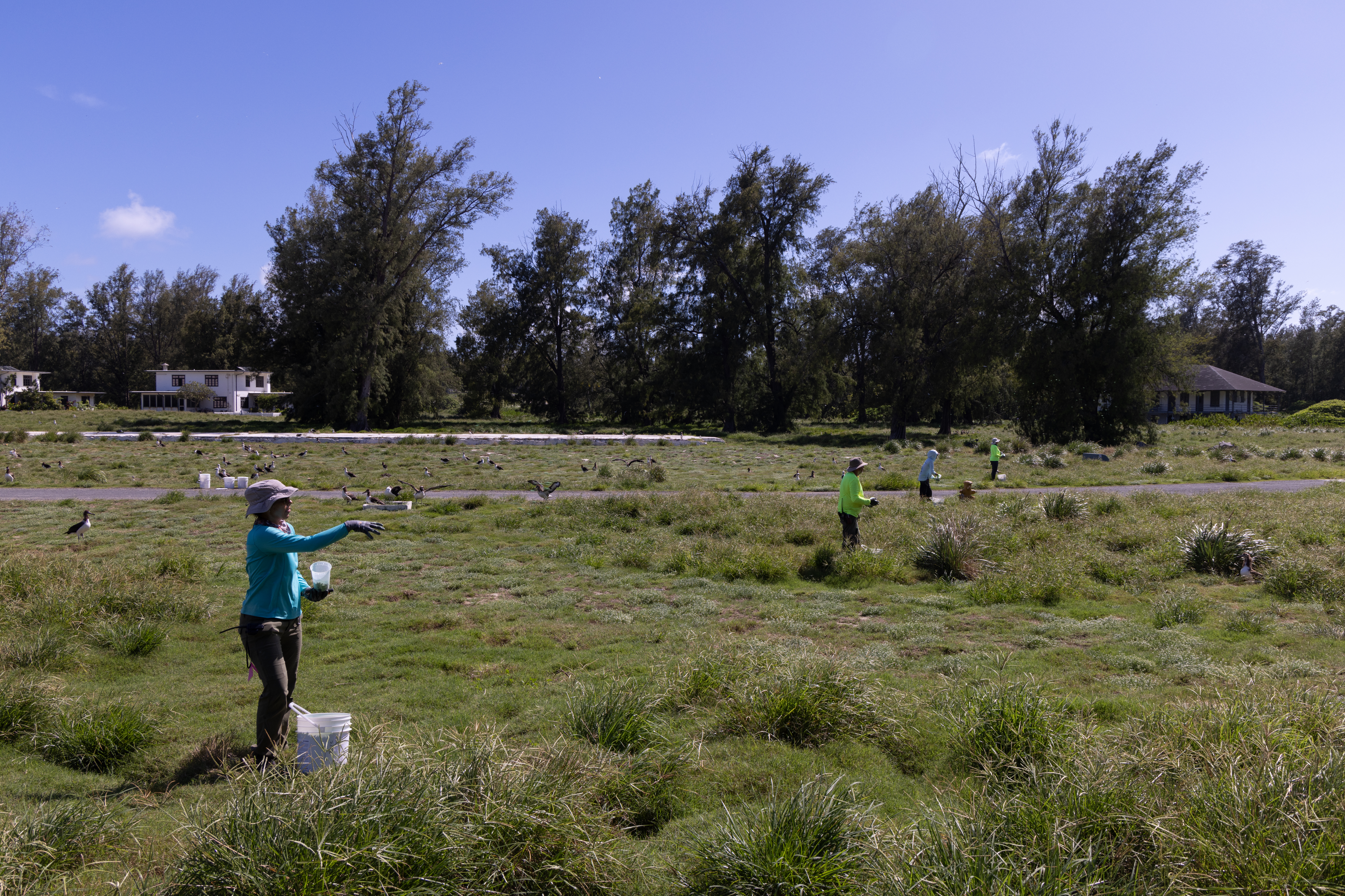 Members of the Island Conservation team hand broadcast bait as part of the Seabird Protection Project on Midway Atoll National Wildlife Refuge.