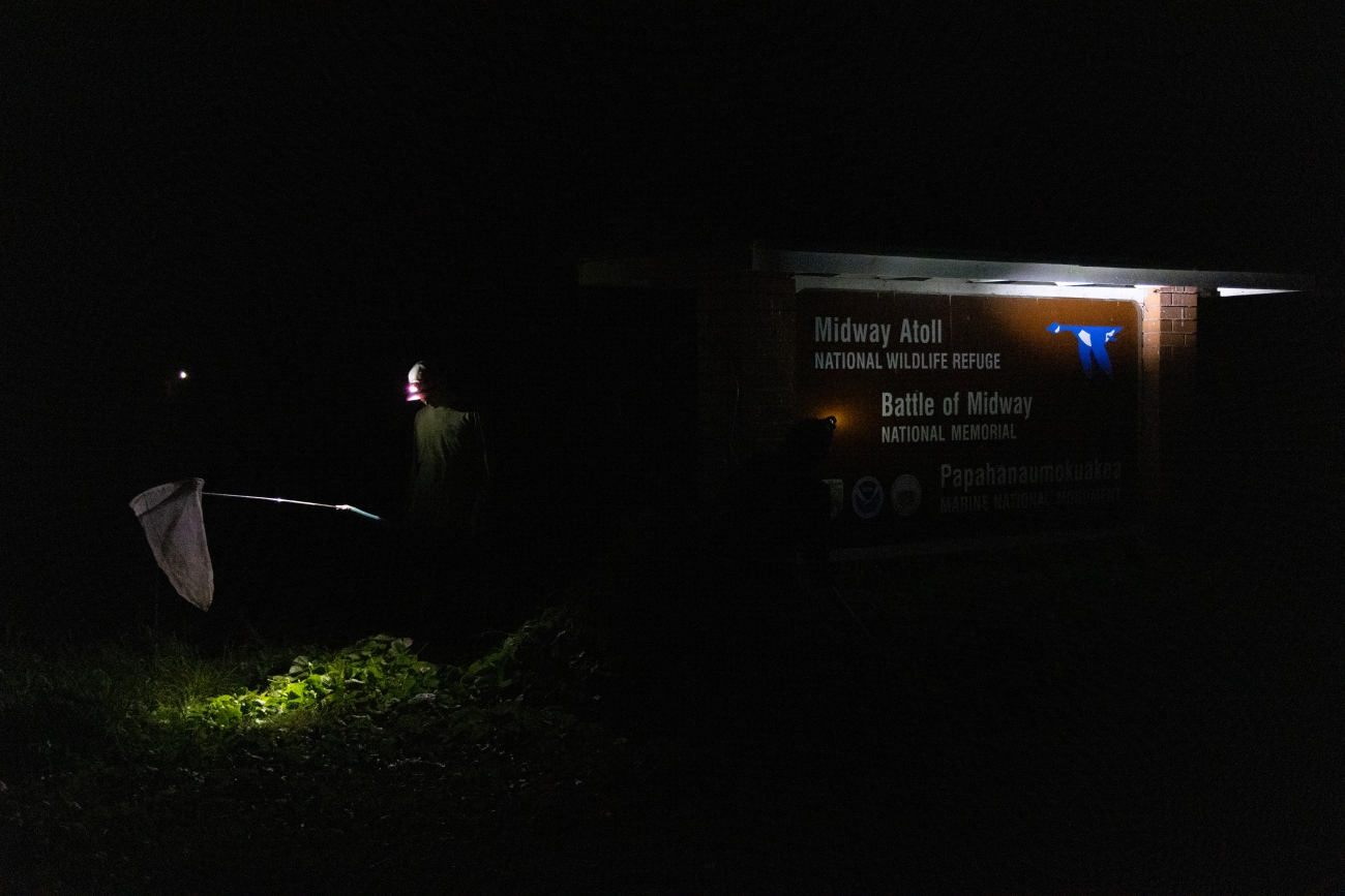 Members of the Sentinel Passerine Team capturing common myna birds at night with flashlights and nets around old buildings on Sand Island on Midway Atoll National Wildlife Refuge during the Seabird Protection Project.