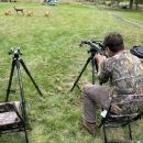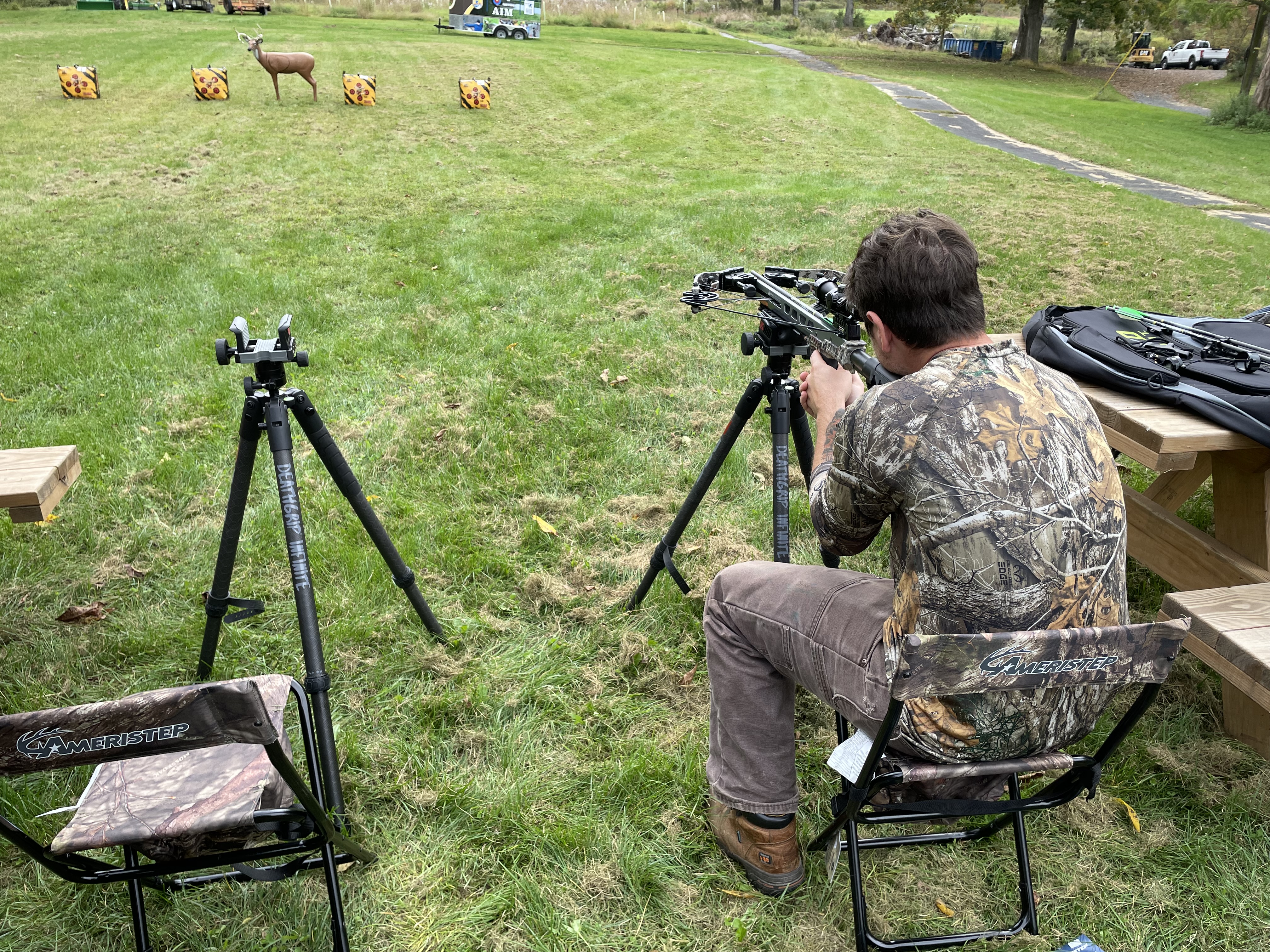 Mentee lines up his crossbow during archery practice at the Field to Fork mentored archery deer hunt at Cherry Valley National Wildlife Refuge in November of 2024