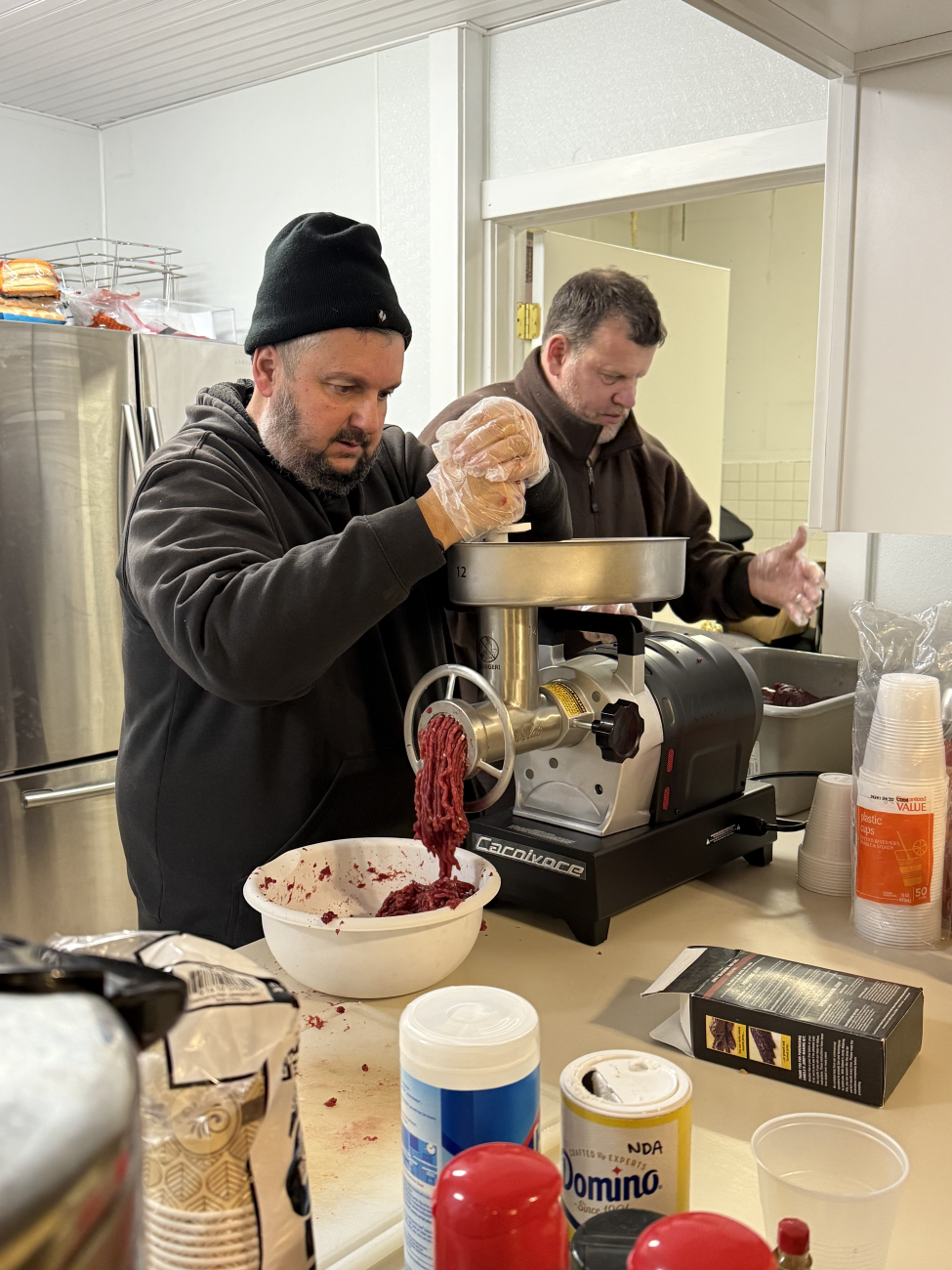 Mentors Mike (L) and George (R) process harvested meat into ground venison to be shared with program participants to take home as part of the Field to Fork mentored rifle deer hunt at Cherry Valley National Wildlife Refuge in December of 2024.