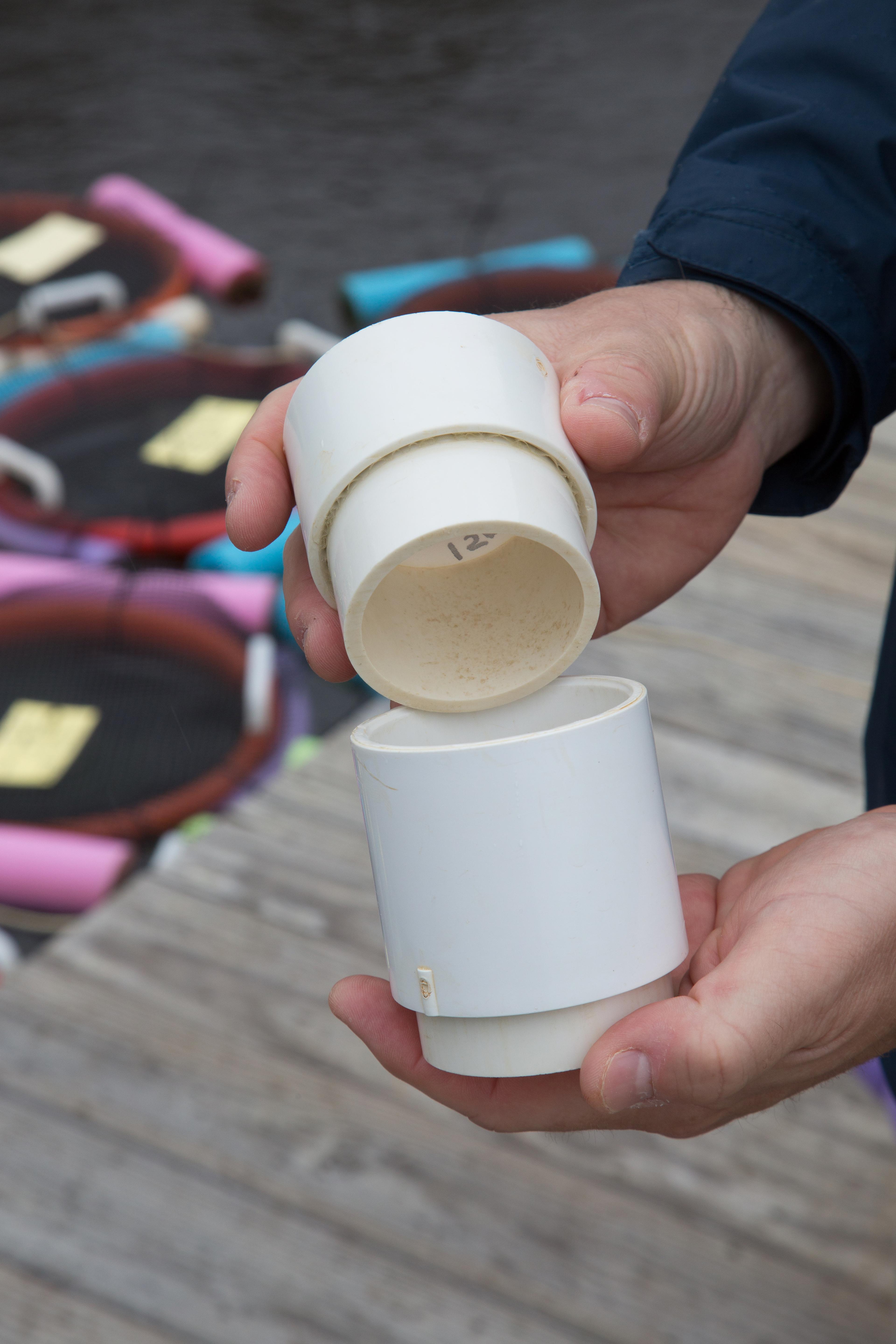 The two sections of the mesh culture chamber separated for demonstration. Photo: Ryan Hagerty, USFWS.