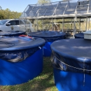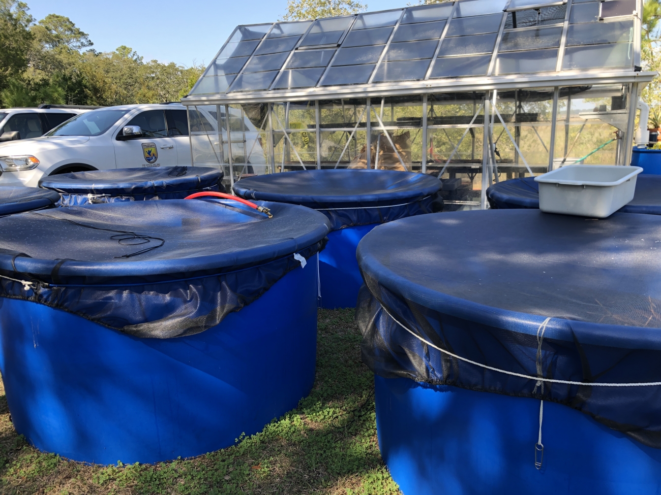 Six blue tanks simulate outdoor ponds where tadpoles develop in captivity, under controlled conditions. Photo by James Henne @ Bears Bluff National Fish Hatchery, South Carolina, 2019.