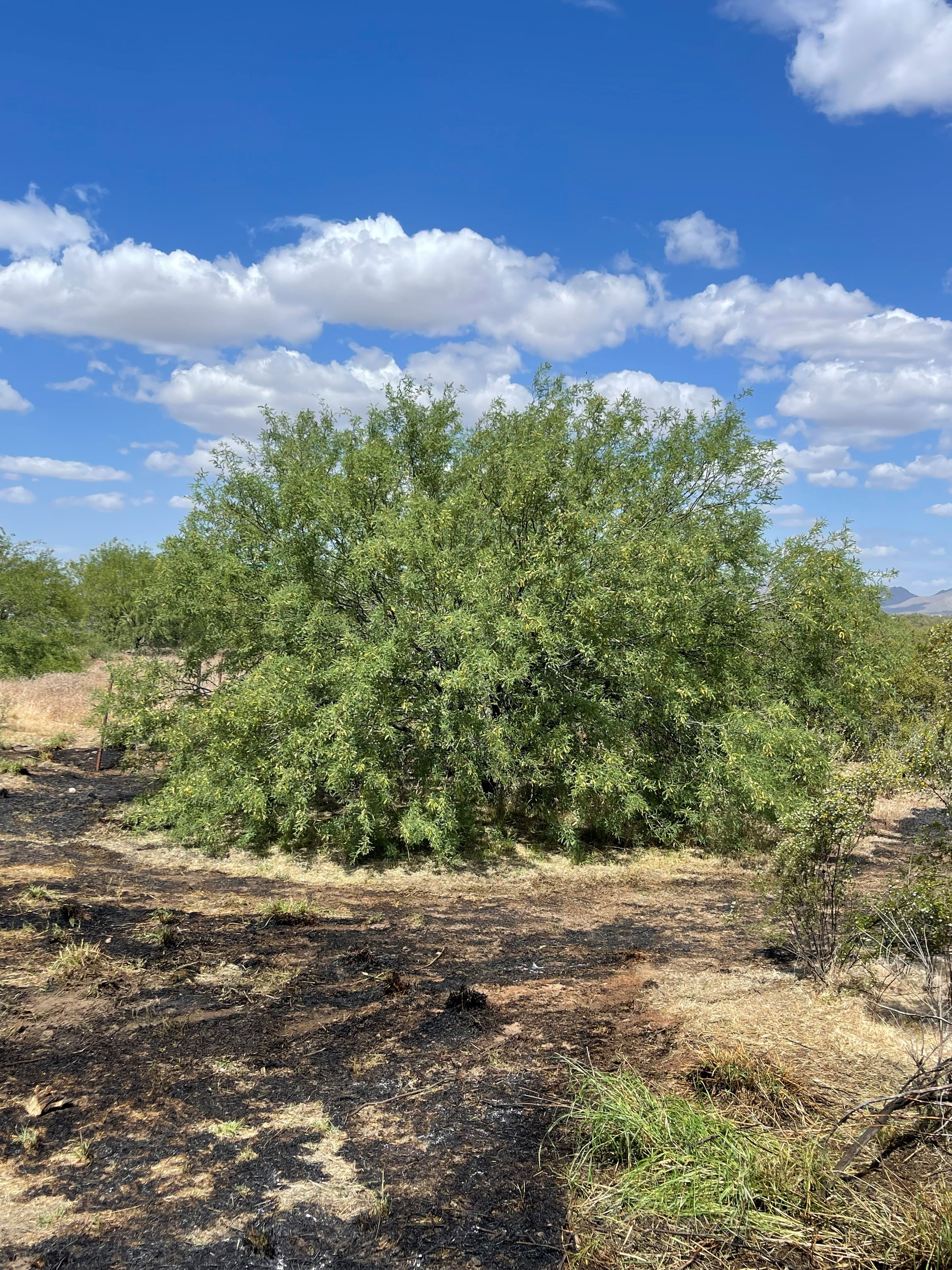 Large mesquite (Prosopis velutina) surrounded by burnt ground and minimal foliage. This demonstrates how Siphon Draw Environmental Services was able to create a mosaic of burned fine fuels and unburned native vegetation, reducing fuel risk by breaking apart continuity of continuous fine fuels, without cutting the native vegetation.