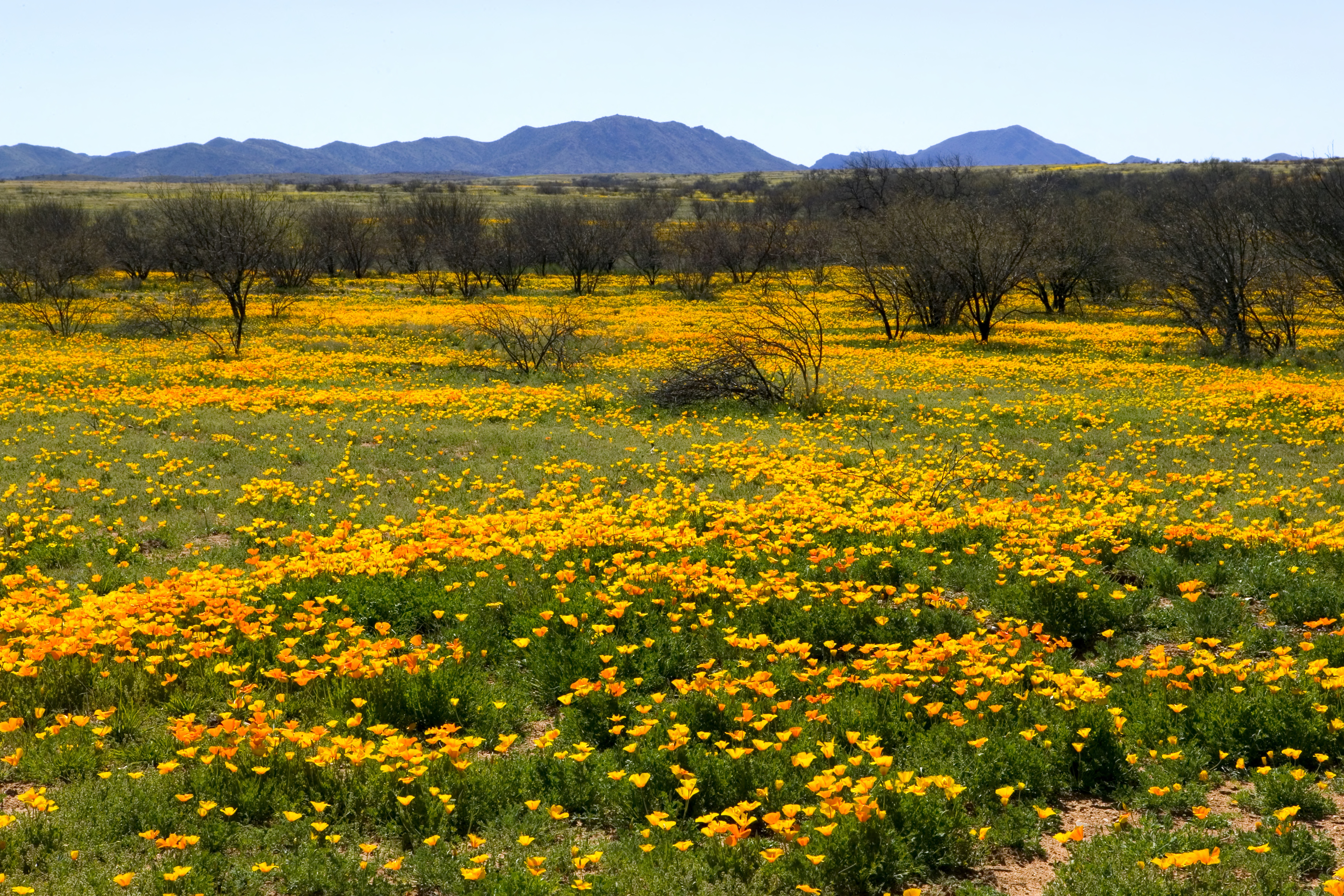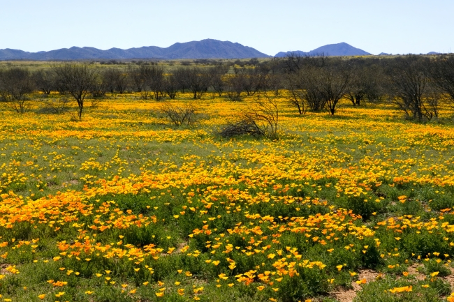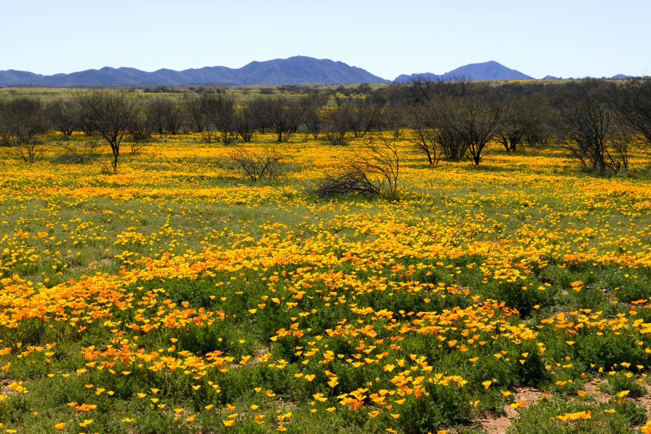 Field of Mexican poppies in peak bloom
