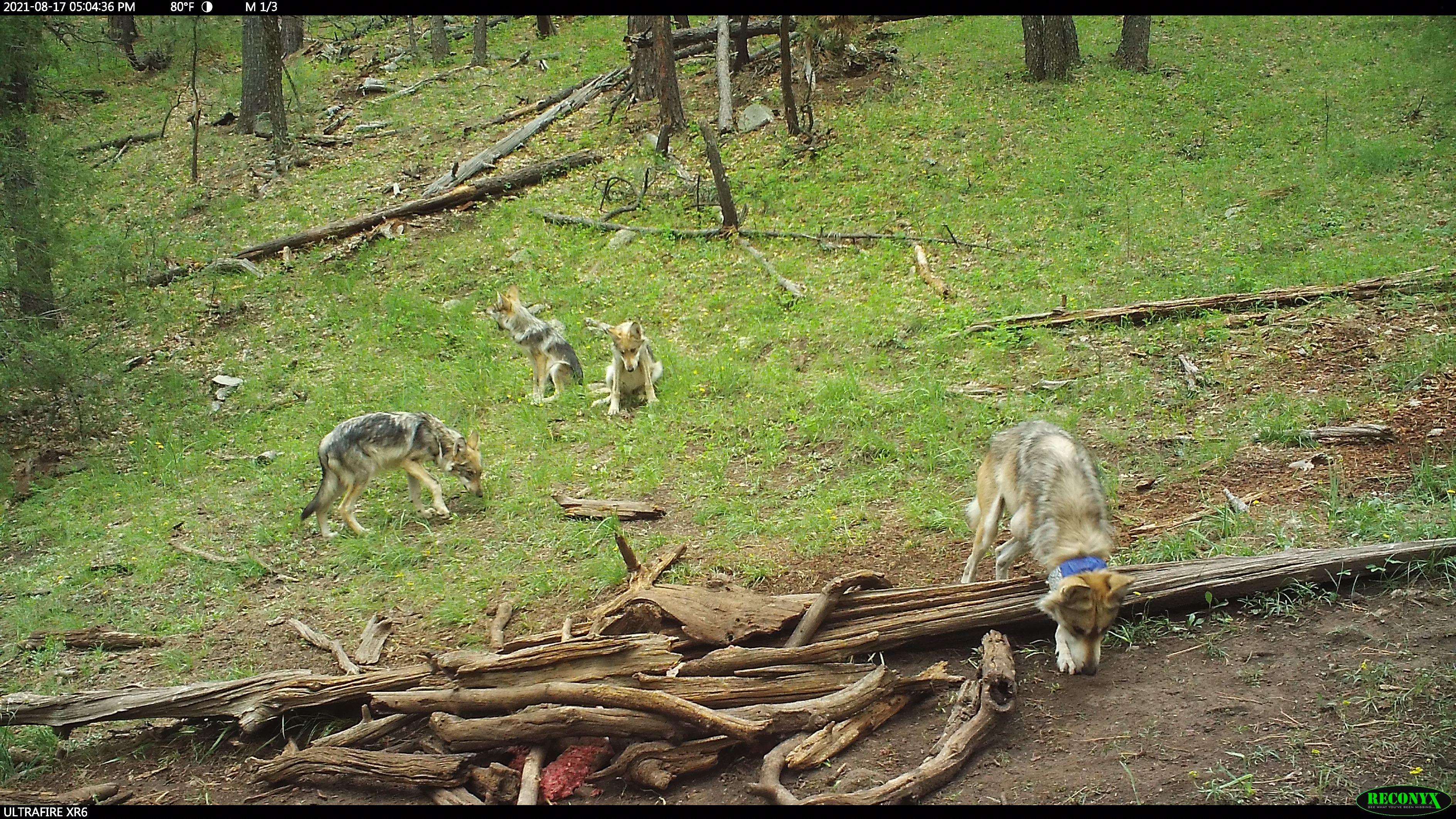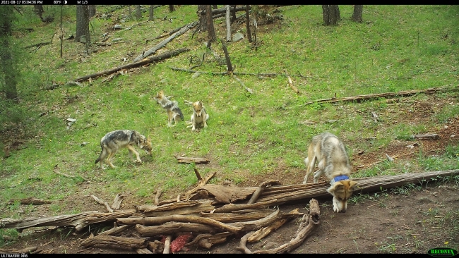 A collared adult Mexican wolf is seen with three pups on a trail camera photo.