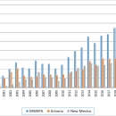 Figure 1. Minimum population estimate and population estimate numbers depicted per state, 1998 - 2019. Arizona estimate includeswolf numbers documented on the Fort Apache Indian Reservation and the San Carlos Apache Reservation.