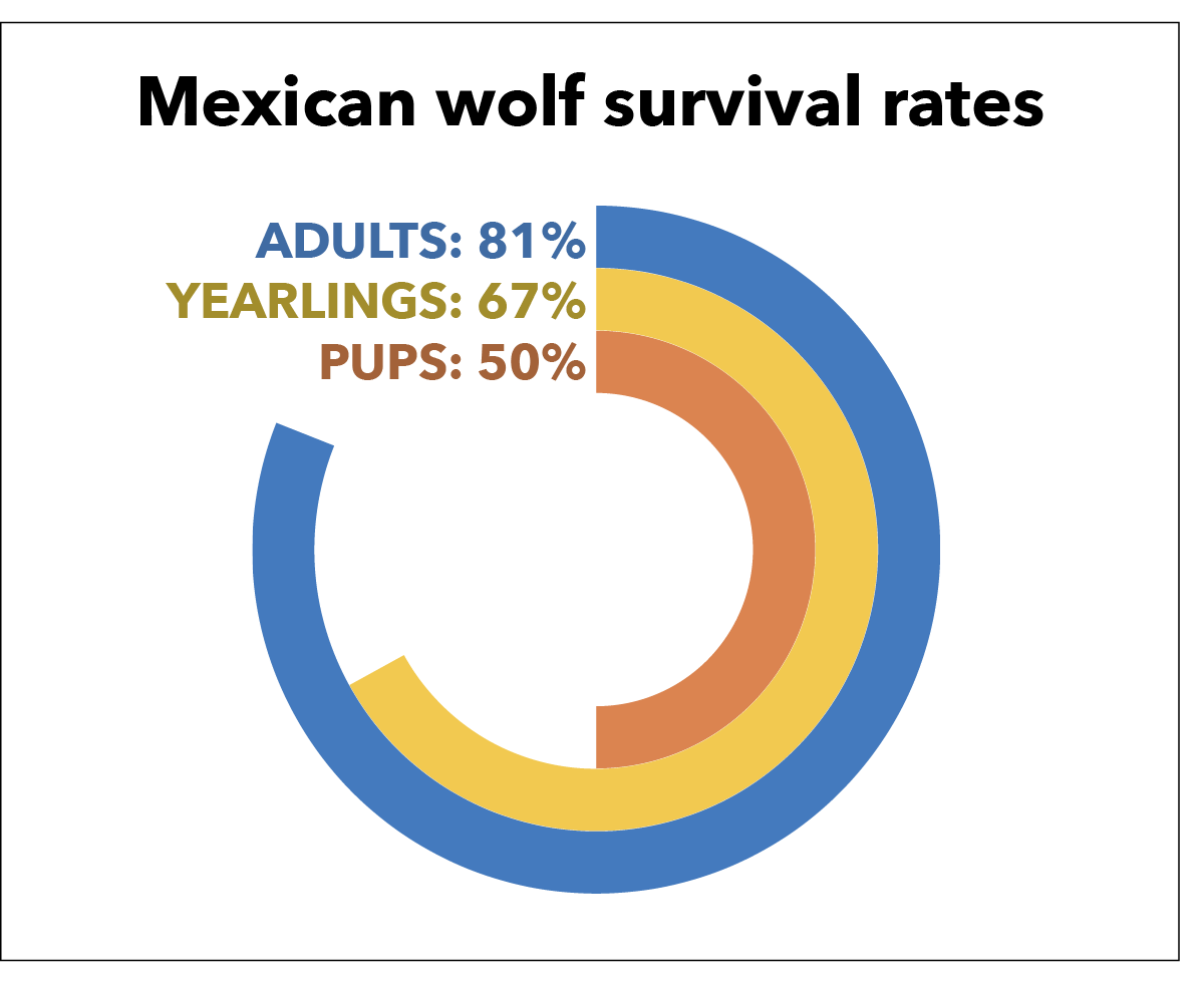 The expected survival of Mexican wolves depending on their developmental stage. Survival is defined as living for one year at the specified age group.