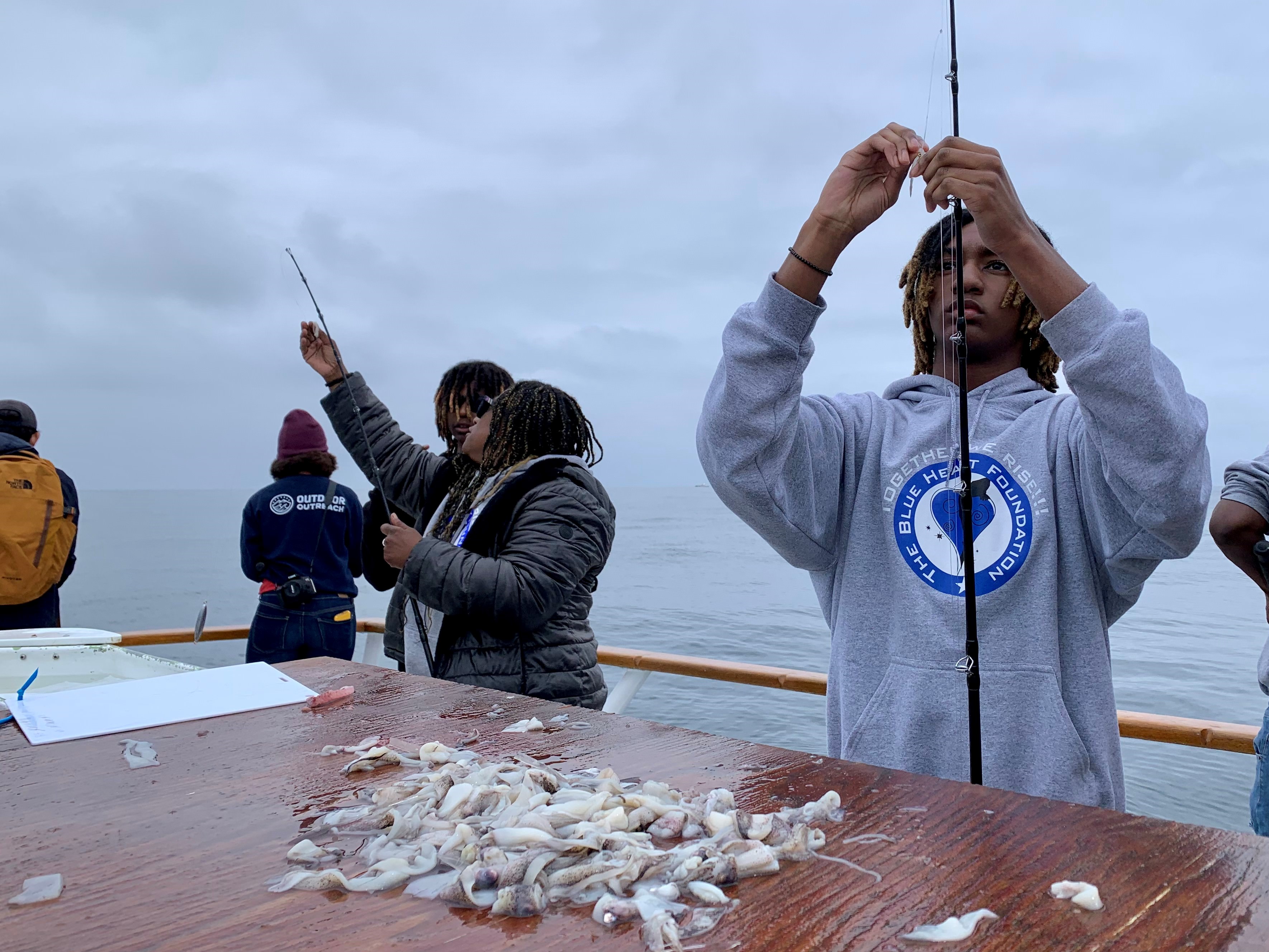 Michael Lazare, on the right, hooks squid bait. On the left, Program Director for the Blue Heart Foundation, Tammy Blevins, helps another youth hook bait (USFWS).