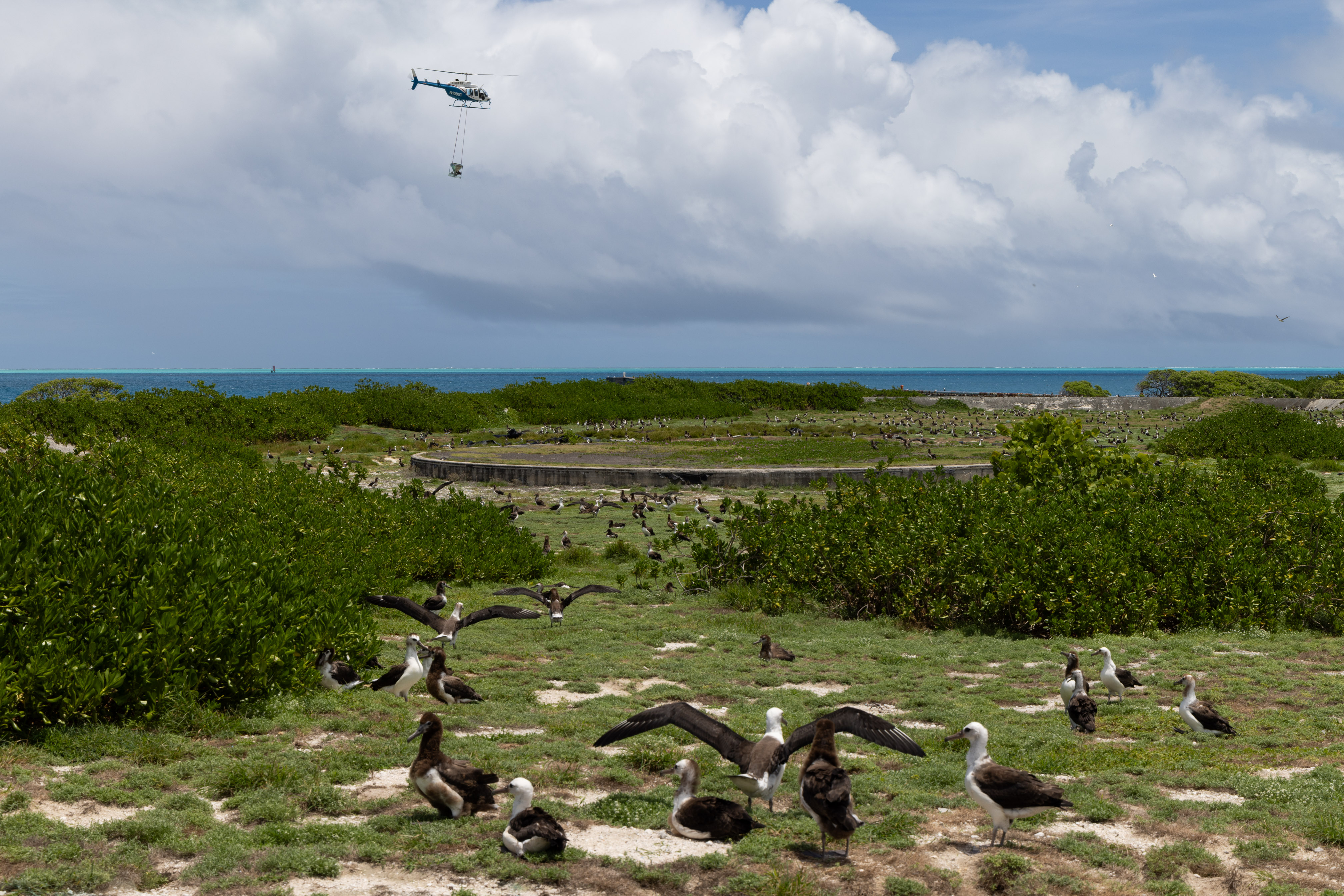 Helo flying over all fuel tank foundation, good LAAL in foreground, ocean beyond