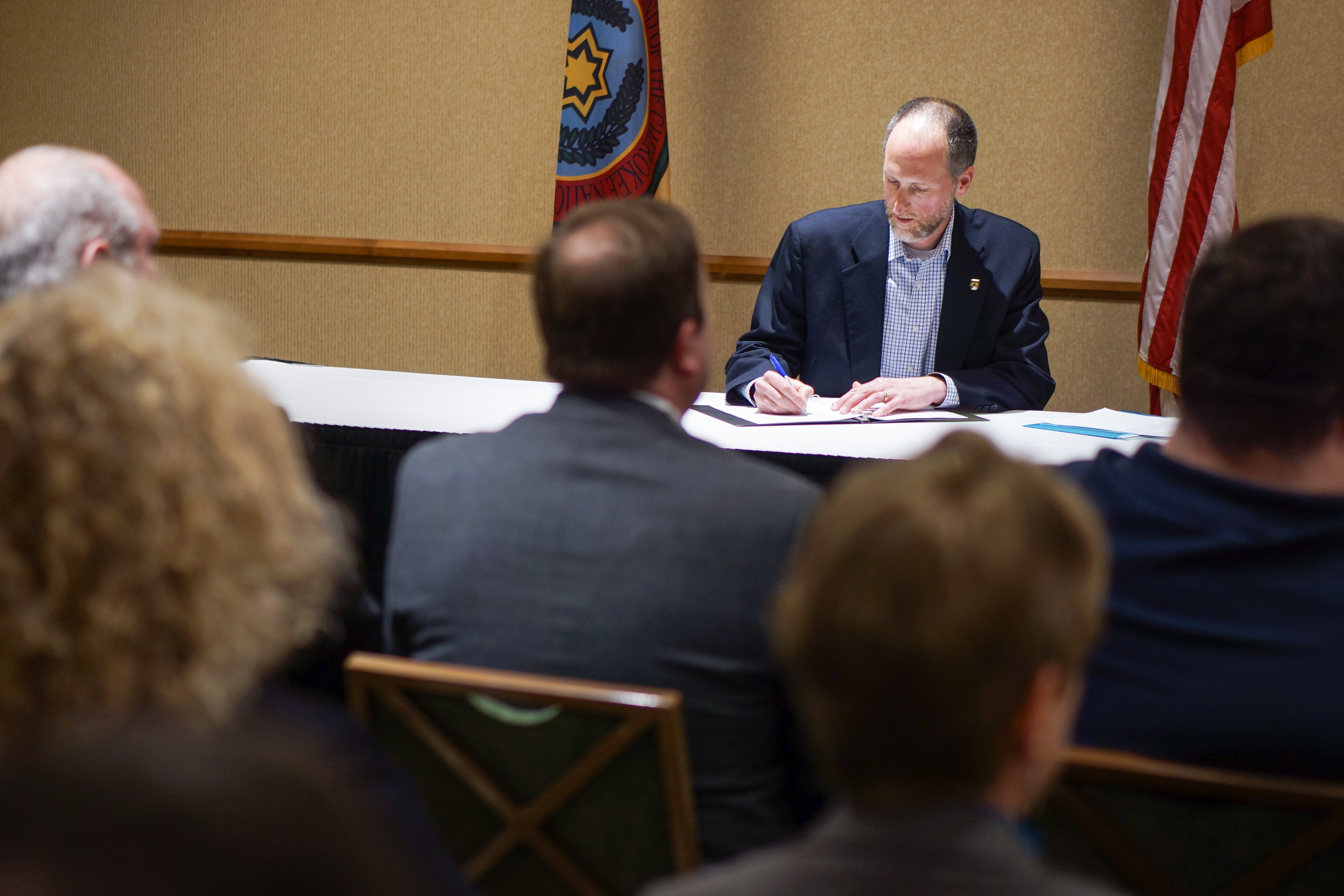 Mike Oetker signs a Candidate Conservation Agreement for the sicklefin redhorse
