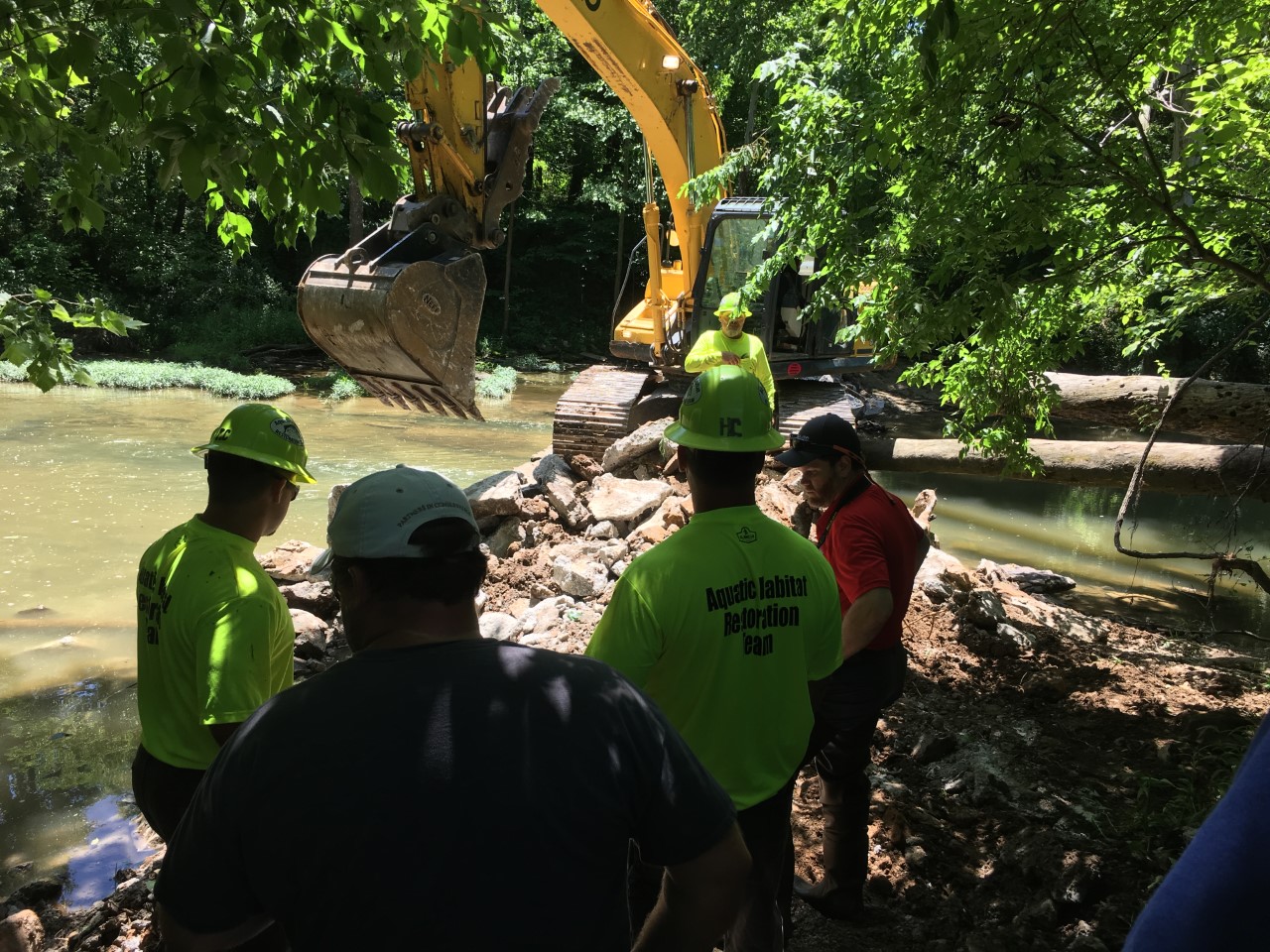 The Aquatic Habitat Restoration Team watches as the heavy equipment operator removes a dam on Mill Creek