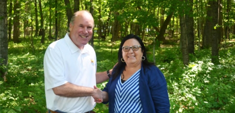 Charles Wooley, U.S. Fish and Wildlife Service's Midwest Region Deputy Regional Director and Melanie Benjamin Millie Lacs, Band of Ojibwe, Chief Executive, shaking hands for a 20 year partnership in wildlife conservation.