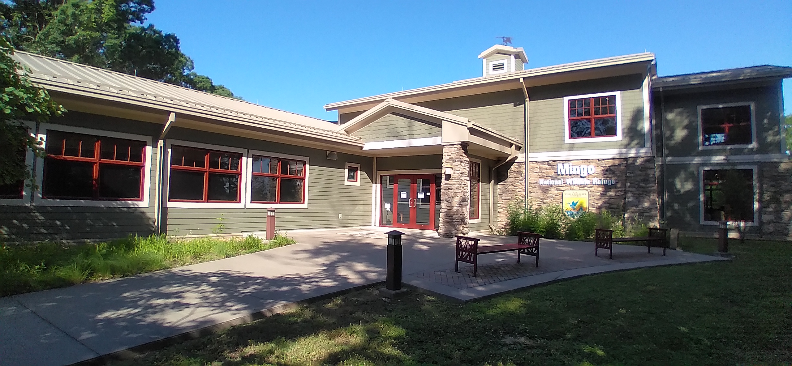 Mingo National Wildlife Refuge Visitor Center with sun shining on the front door.