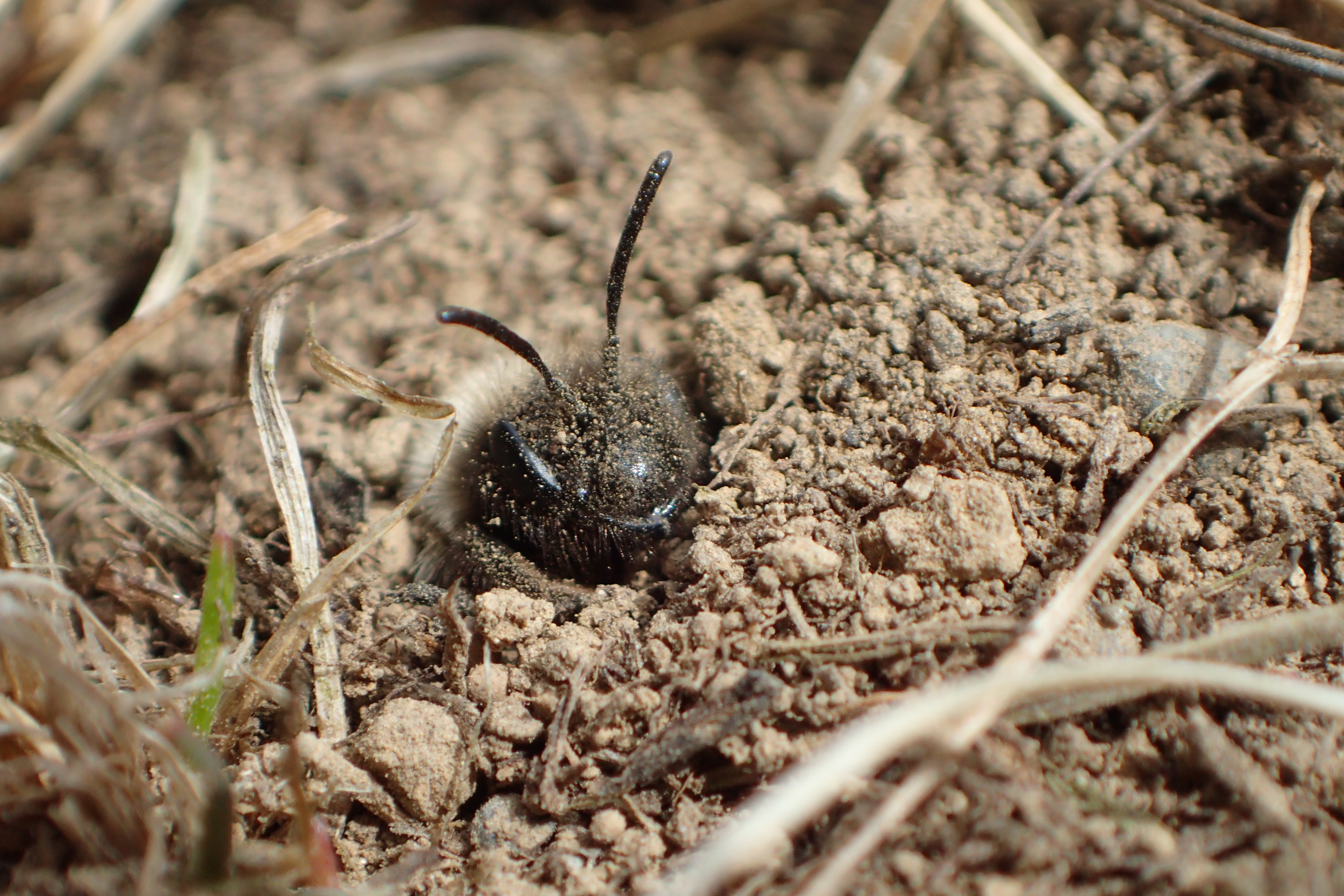 A mining bee (genus Andrena) emerges from its burrow behind the Kenai National Wildlife Refuge's headquarters building in Alaska.