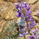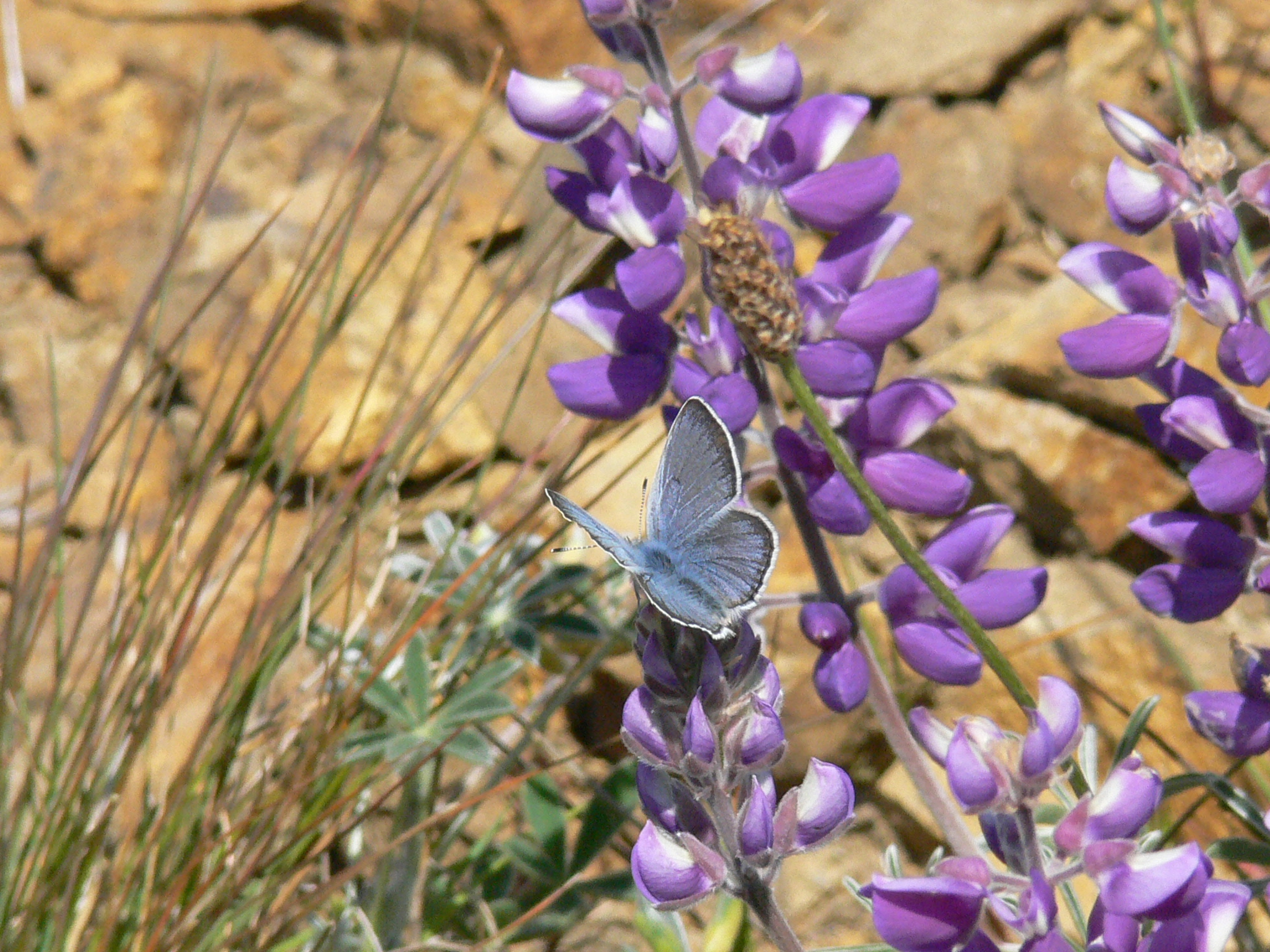 A male Mission Blue butterfly rests upon a Silver Bush Lupine (Lupinus albifrons). As of 14 December 2009, the 'mission blue Butterfly' (Icaricia icarioides missionensis) is listed as Endangered under the U.S. Endangered Species Act.
