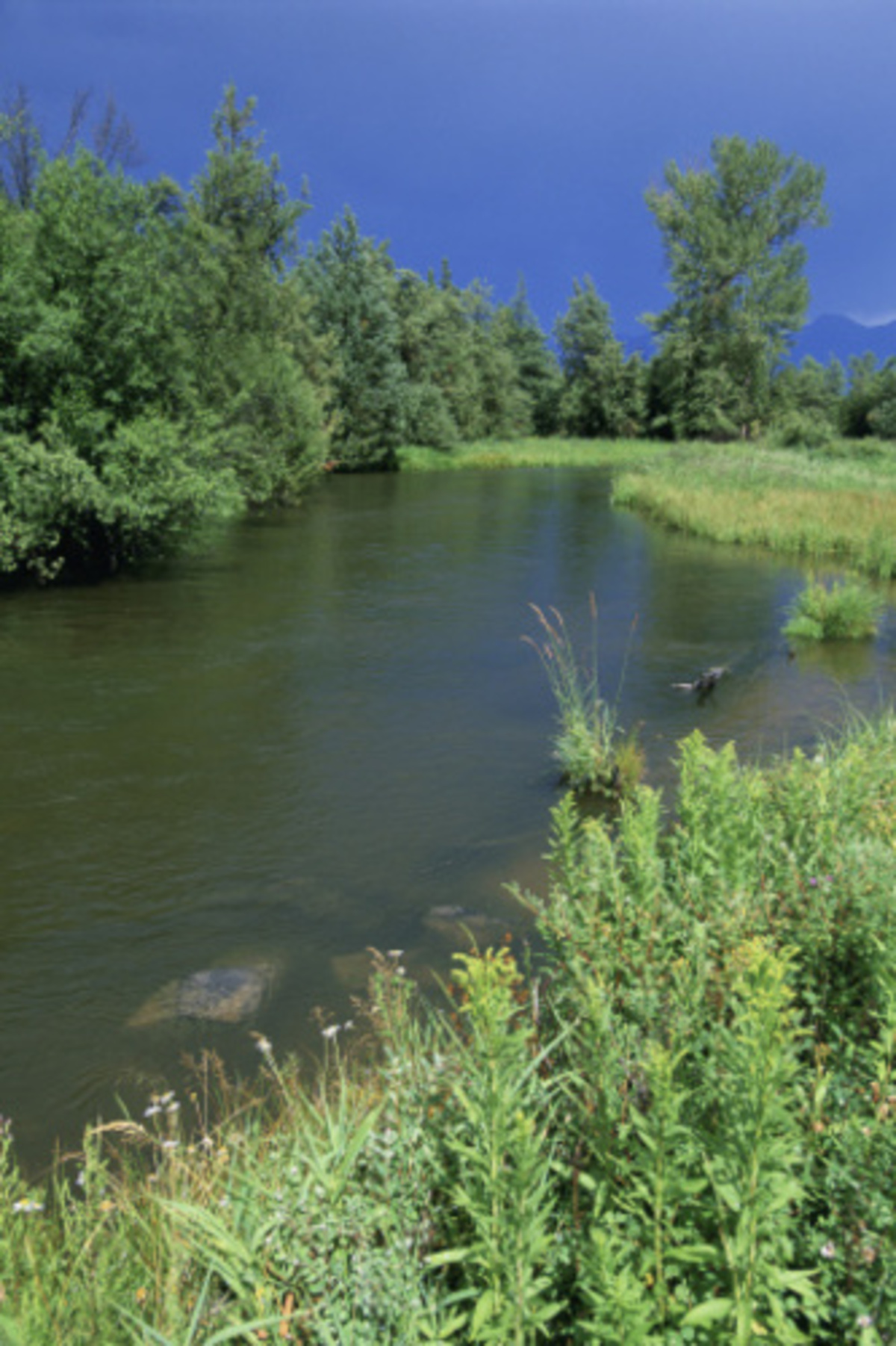 Mission Creek with storm clouds in distance at National Bison Range, Montana.