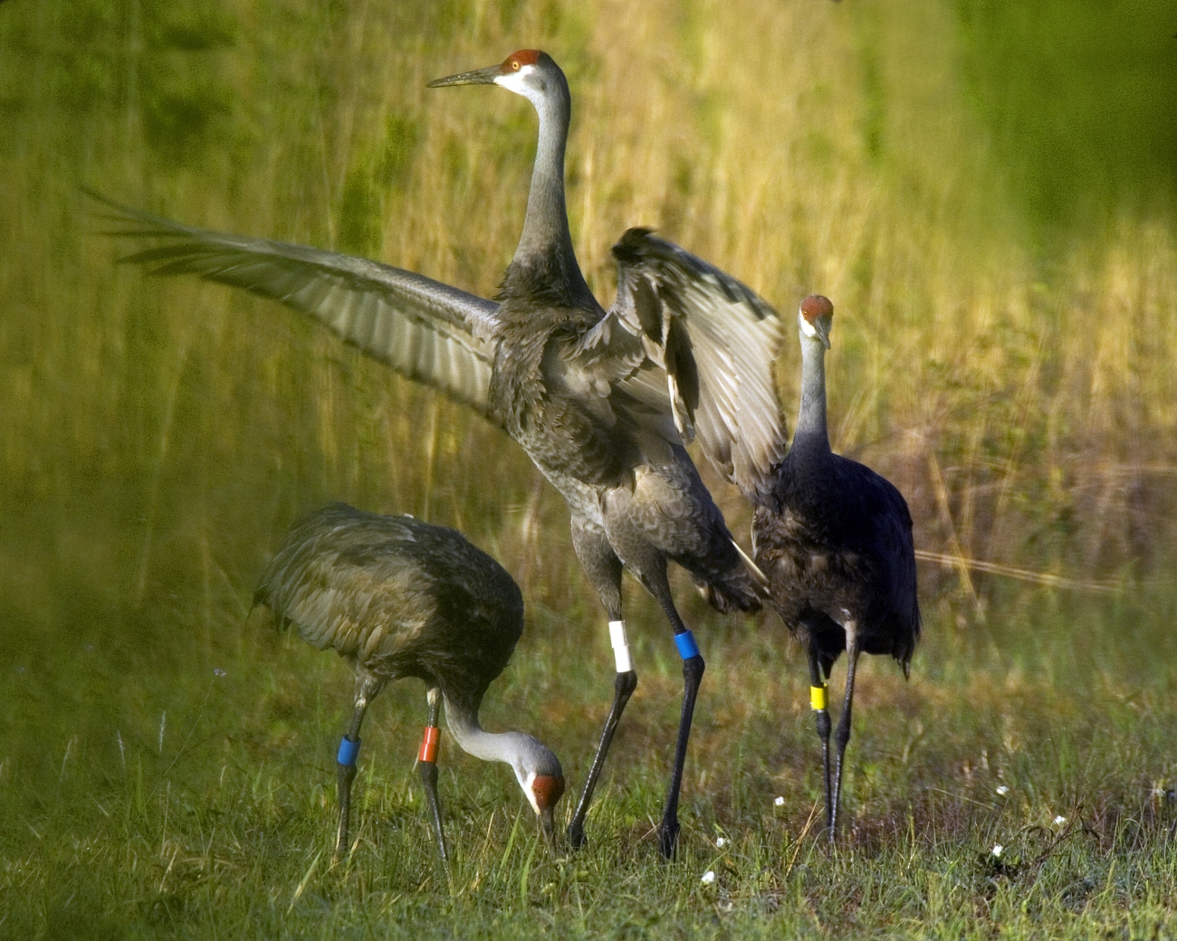 Three Mississippi Sandhill Crane flock together in the grass.