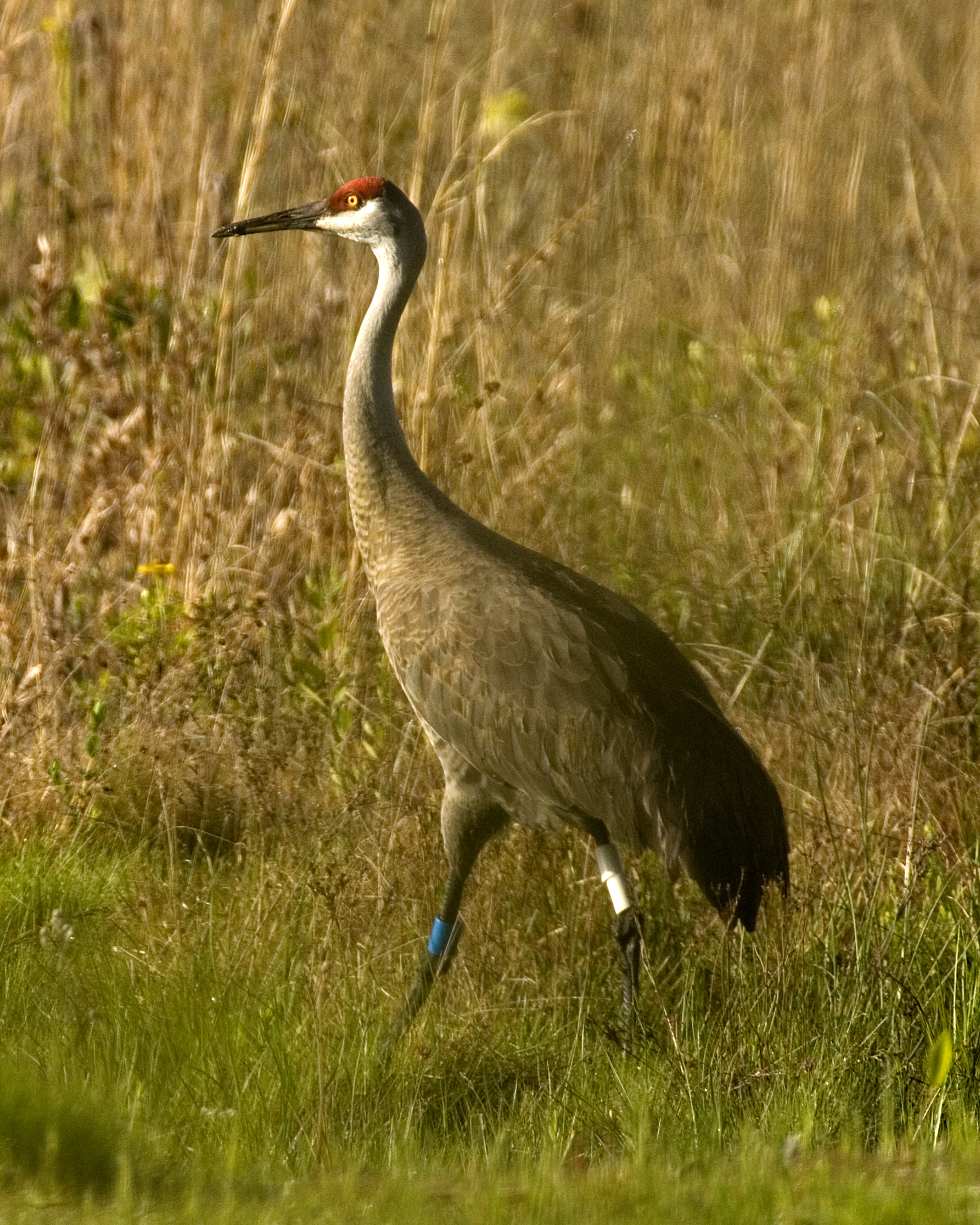 The background grass is the perfect camouflage for this Mississippi Sandhill Crane.