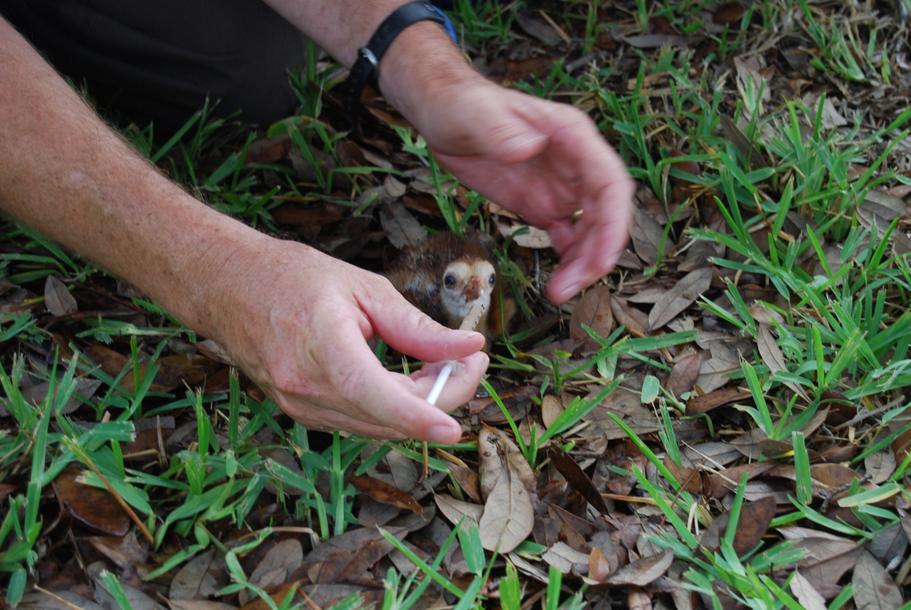 Fish and Wildlife Service employee feeds a baby Mississippi Sandhill crane.