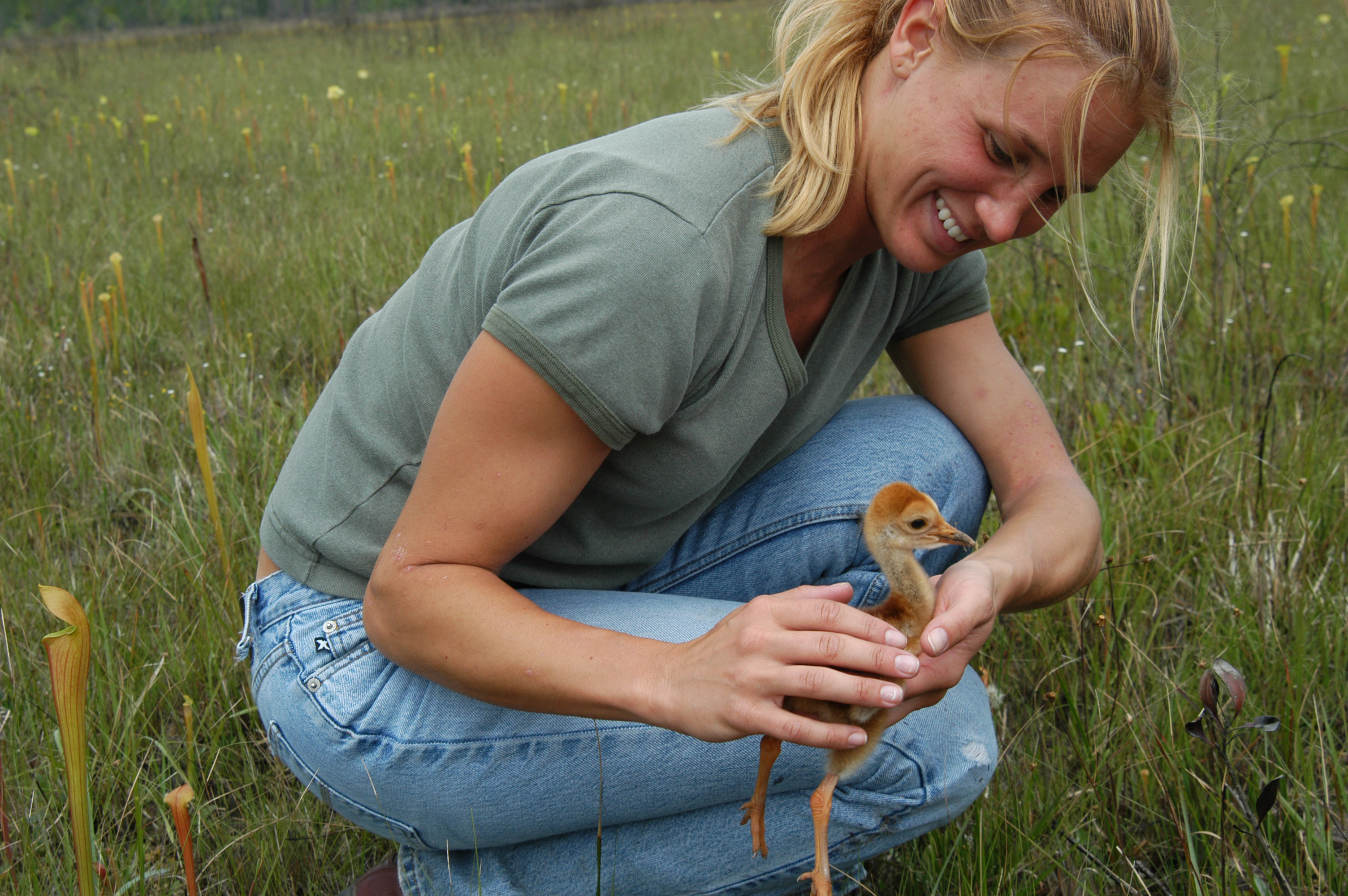 Woman holds a baby Mississippi Sandhill crane.