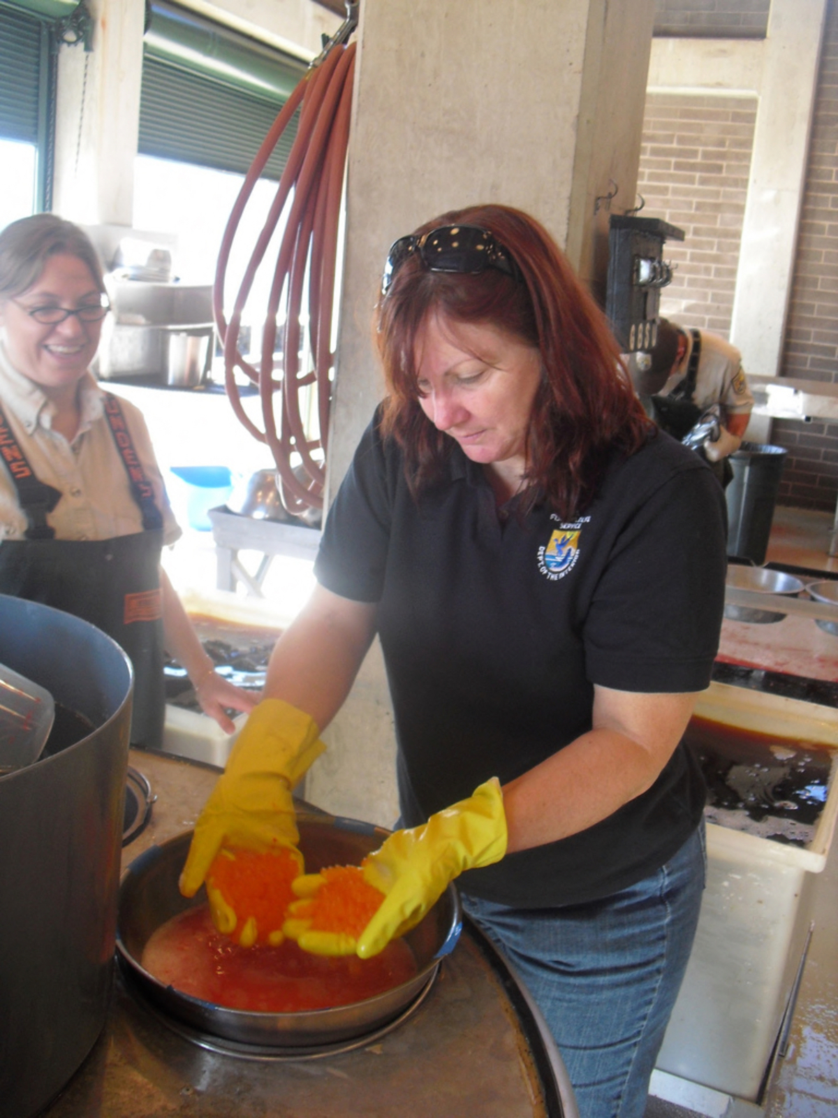 Jane Chorazy, FWS External Affairs Specialist, assists with one of the many spawning tasks. Here she is mixing the harvested eggs with water and the milt (liquid containing the sperm) from the males. Image taken from USFWS Pacific Region Flickr page.