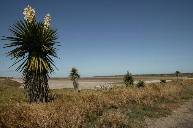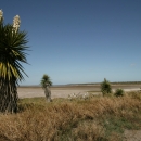 Scenic photograph of Mojave Yucca plant and cactus near water.
