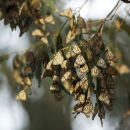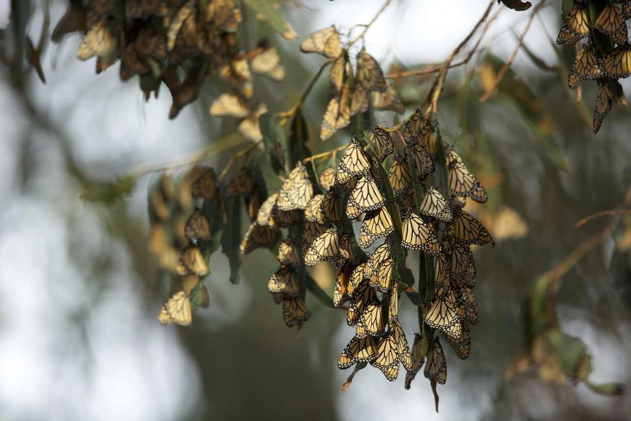 Monarch butterfly population overwintering in Pismo Beach, California. North American monarchs travel up to an astonishing 3,000 miles in an annual migration from their summer breeding habitat to overwintering grounds.