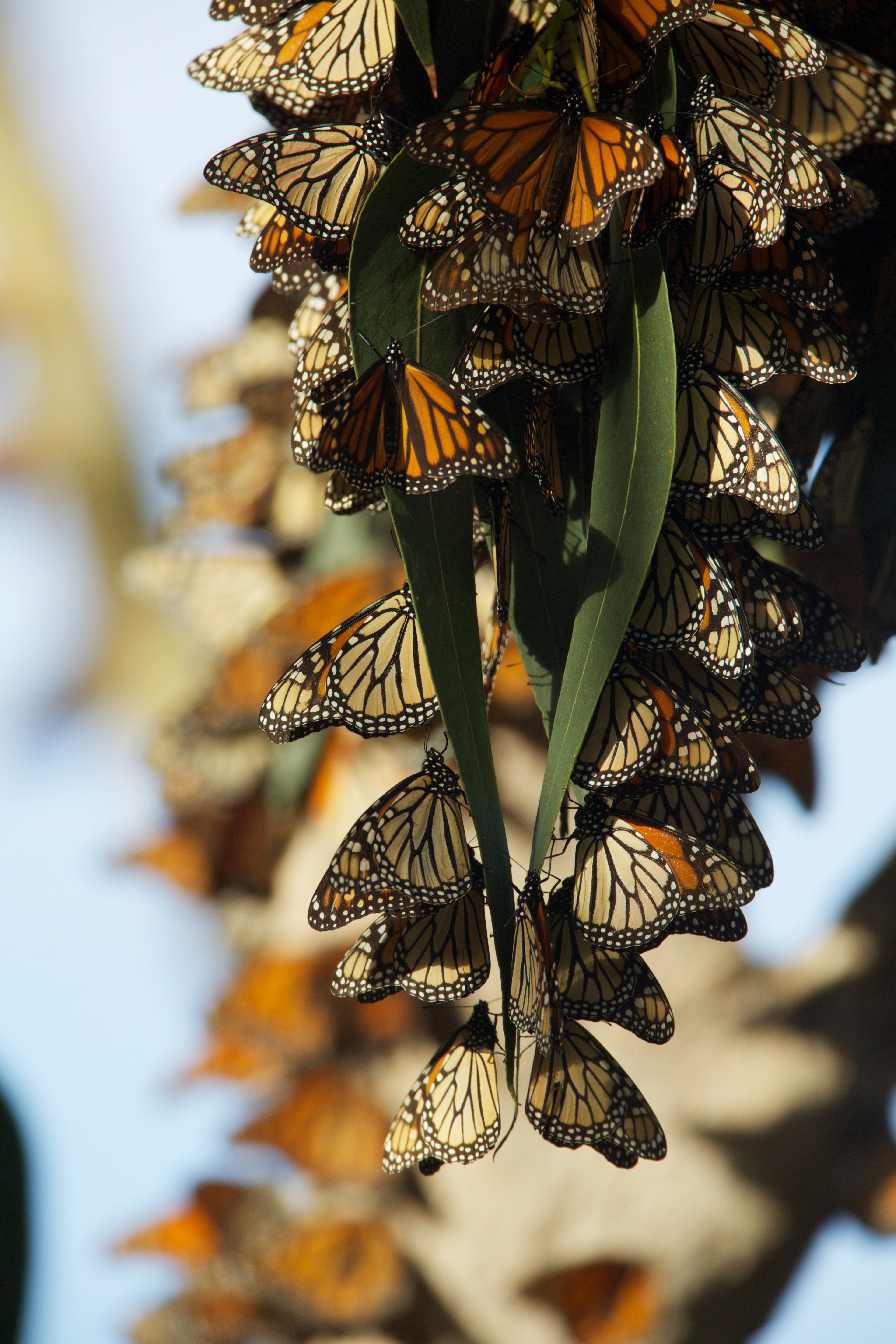 Monarch butterfly population overwintering in Pismo Beach, California. North American monarchs travel up to an astonishing 3,000 miles in an annual migration from their summer breeding habitat to overwintering grounds.