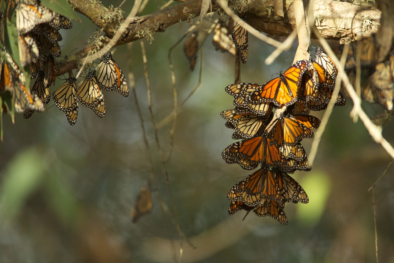 Monarch butterfly population overwintering in Pismo Beach, California. North American monarchs travel up to an astonishing 3,000 miles in an annual migration from their summer breeding habitat to overwintering grounds.