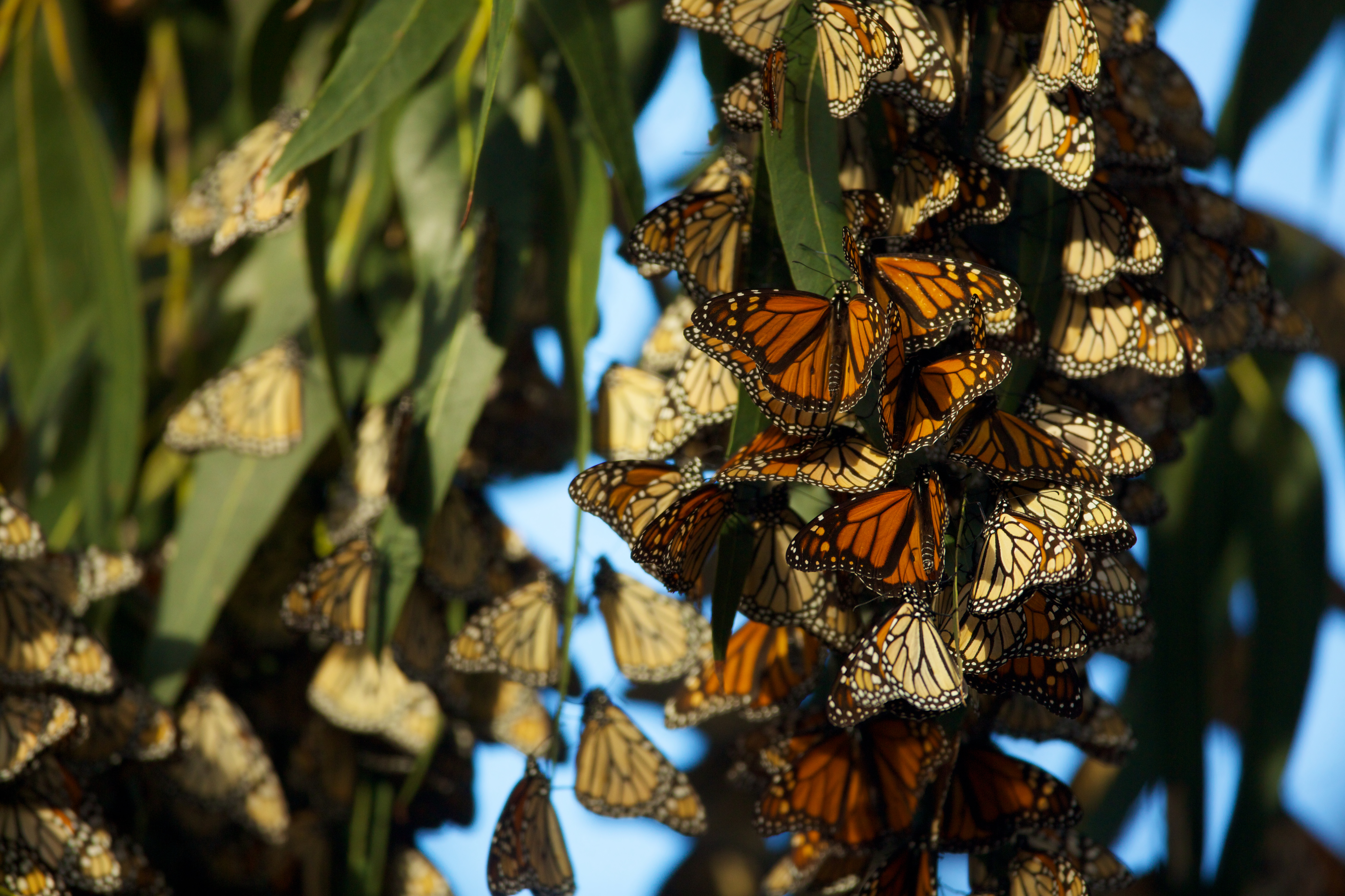 Monarch butterfly population overwintering in Pismo Beach, California. North American monarchs travel up to an astonishing 3,000 miles in an annual migration from their summer breeding habitat to overwintering grounds.