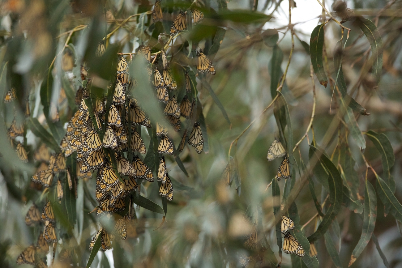 Monarch butterfly population overwintering in Pismo Beach, California. North American monarchs travel up to an astonishing 3,000 miles in an annual migration from their summer breeding habitat to overwintering grounds.