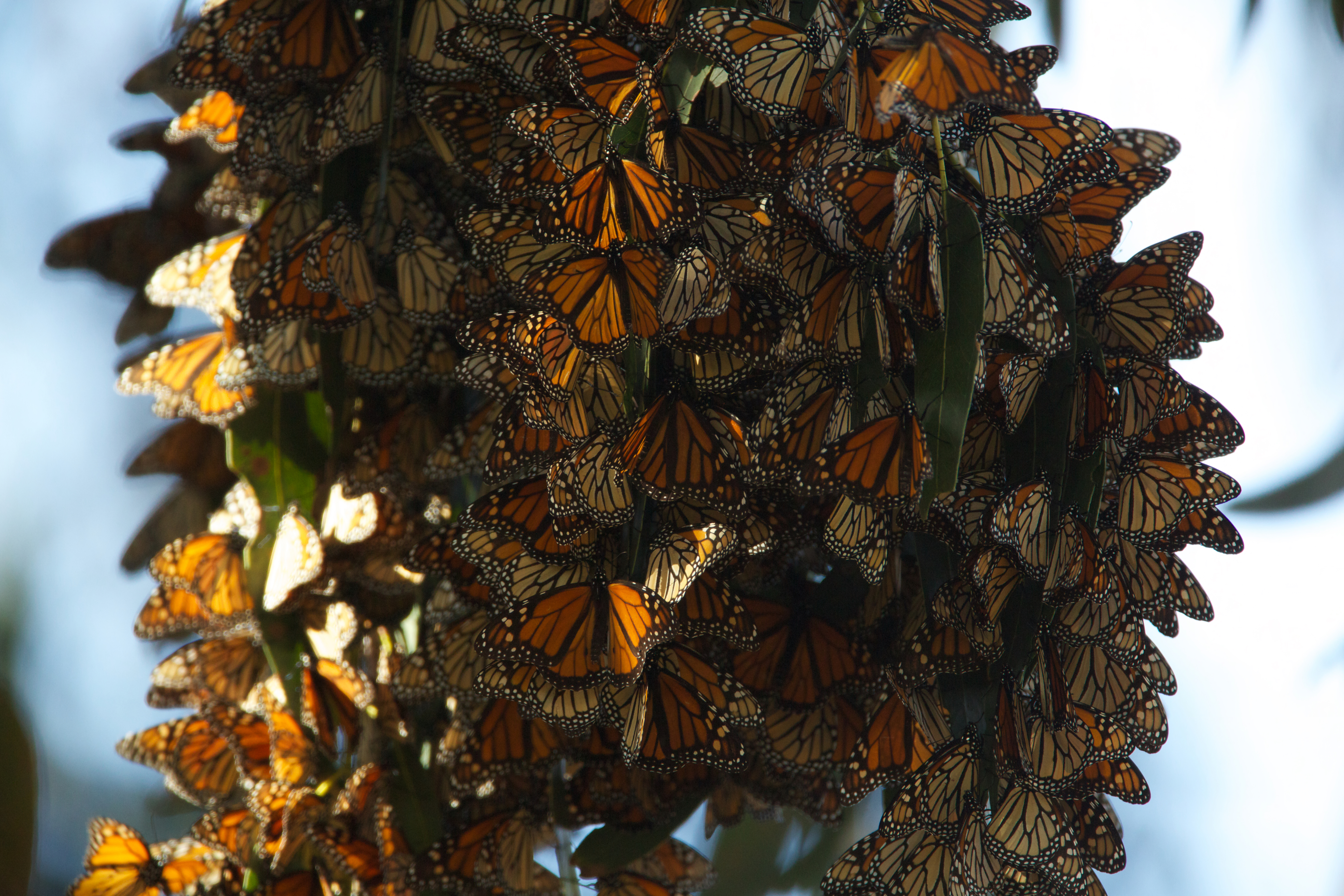 Monarch butterfly population overwintering in Pismo Beach, California. North American monarchs travel up to an astonishing 3,000 miles in an annual migration from their summer breeding habitat to overwintering grounds.