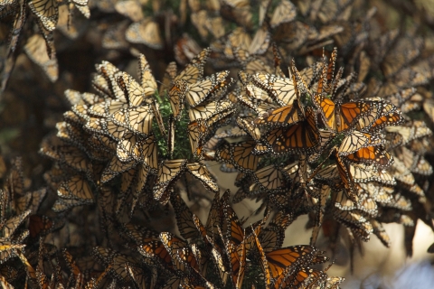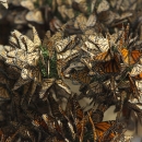 Monarch butterfly population overwintering in Pismo Beach, California. North American monarchs travel up to an astonishing 3,000 miles in an annual migration from their summer breeding habitat to overwintering grounds.